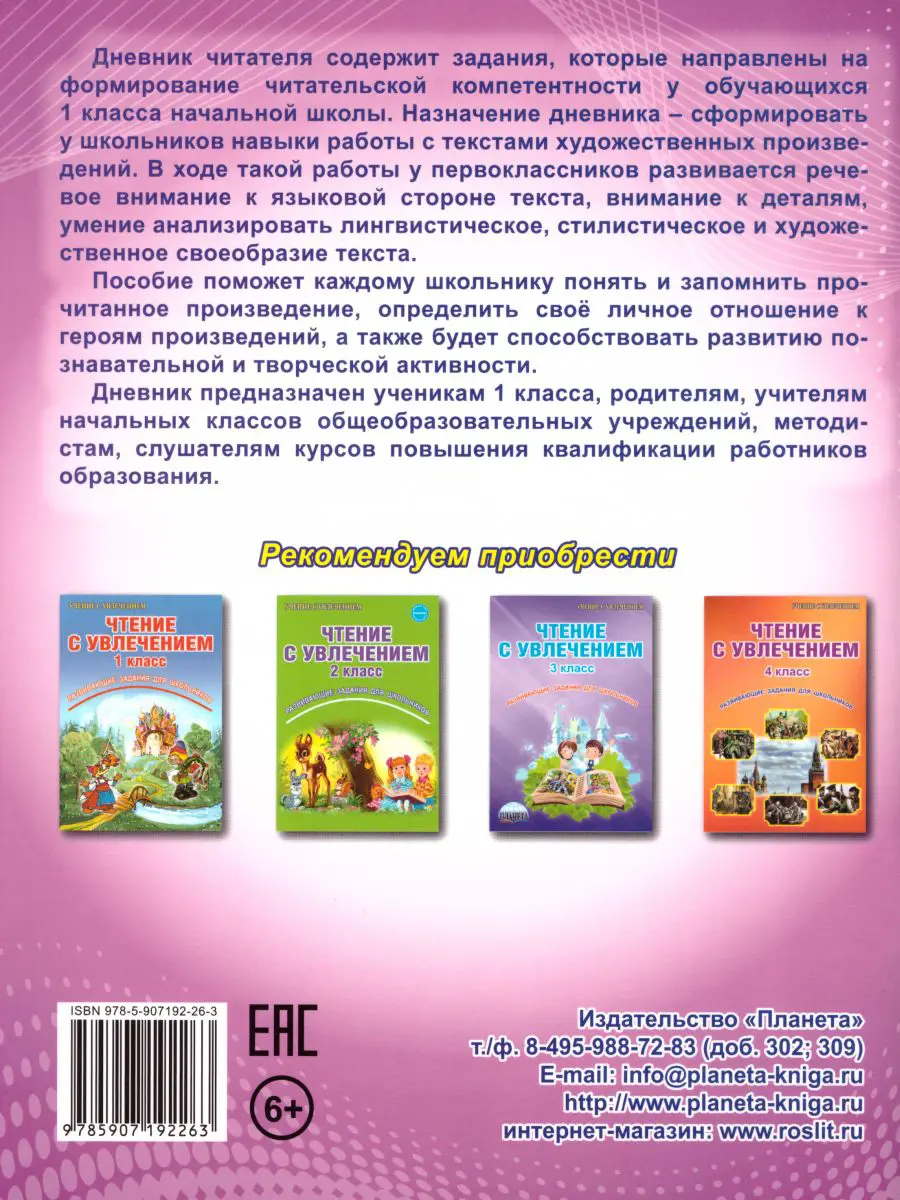 Дневник предназначен ученикам 1 класса, родителям, учителям начальных классов общеобразовательных учреждений, методистам, слушателям курсов повышения квалификации работников образования.