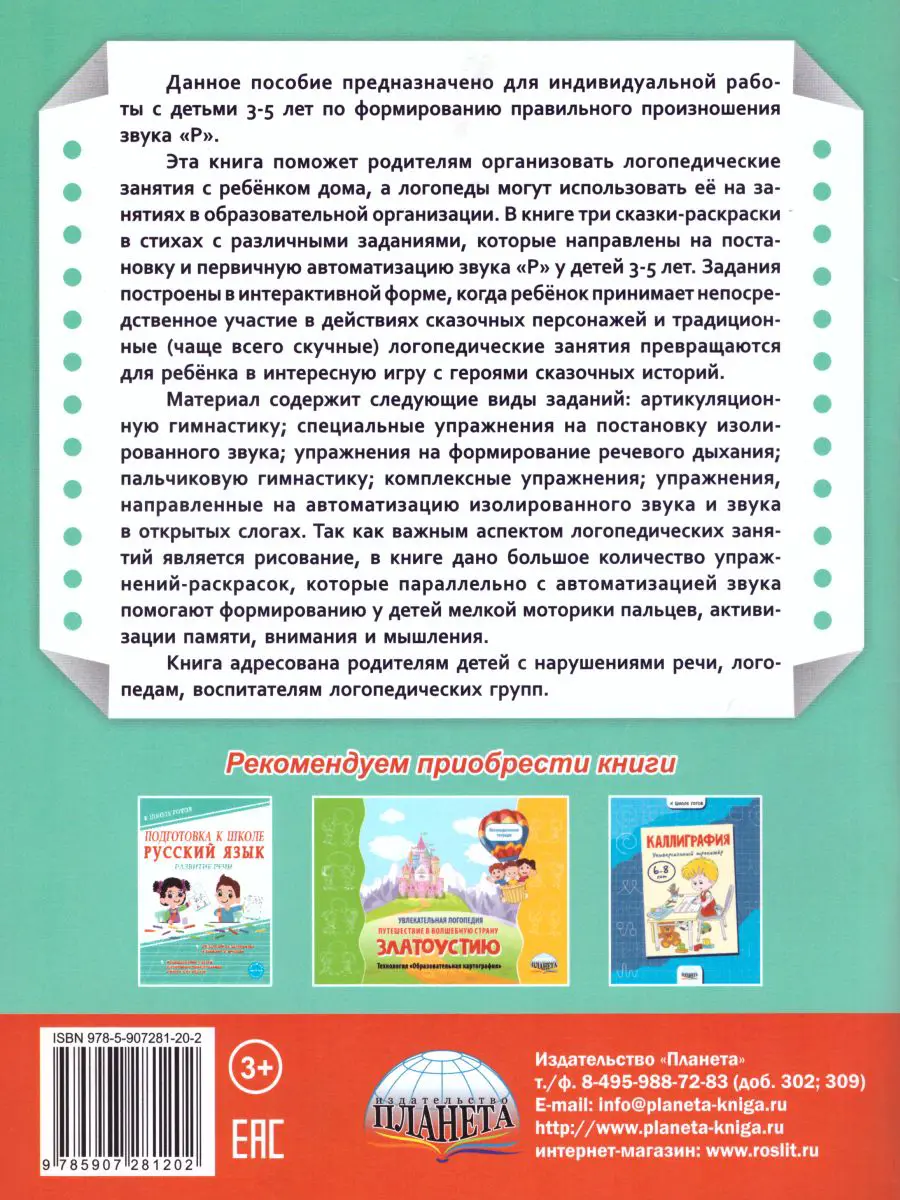 Эта книга поможет родителям организовать логопедические занятия с ребёнком дома, а логопеды могут использовать её на занятиях в образовательной организации. В книге три сказки-раскраски в стихах с различными заданиями, которые направлены на постановку и первичную автоматизацию звука «Р» у детей 3-5 лет. Задания построены в интерактивной форме, когда ребёнок принимает непосредственное участие в действиях сказочных персонажей и традиционные (чаще всего скучные) логопедические занятия превращаются для ребёнка в интересную игру с героями сказочных историй.