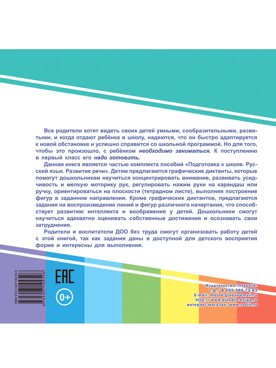 Данная книга является частью комплекта пособий «Подготовка к школе. Русский язык. Развитие речи». Детям предлагаются графические диктанты, которые помогут дошкольникам научиться концентрировать внимание, развивать усидчивость и мелкую моторику рук, регулировать нажим руки на карандаш или ручку, ориентироваться на плоскости (тетрадном листе), выполняя построение фигур в заданном направлении. Кроме графических диктантов, предлагаются задания на воспроизведение линий и фигур различного начертания, что способствует развитию интеллекта и воображения у детей.