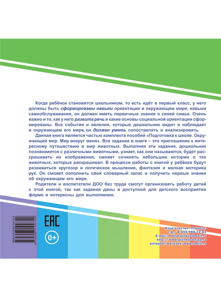 Когда ребёнок становится школьником, то есть идёт в первый класс, у него должны быть сформированы навыки ориентации в окружающем мире, навыки самообслуживания, он должен иметь первичные знания о своей семье. Очень важно и то, как у него развита речь и какие основы социальной ориентации сформированы. Все события и явления, которые дошкольник видит и наблюдает в окружающем его мире, он должен уметь сопоставлять и анализировать. Данная книга является частью комплекта пособий «Подготовка к школе. Окружающий мир. Мир вокруг меня». Все задания в книге – это приглашение к интересному путешествию в мир животных. Выполняя эти задания, дошкольник познакомится с различными животными, узнает, как они называются, будет раскрашивать их изображения, сможет сочинять небольшие истории о тех животных, которых раскрашивал. В процессе работы с книгой у ребёнка будут развиваться кругозор и логическое мышление, фантазия и мелкая моторика рук. Он сможет пополнить свой словарный запас и получить первые знания об