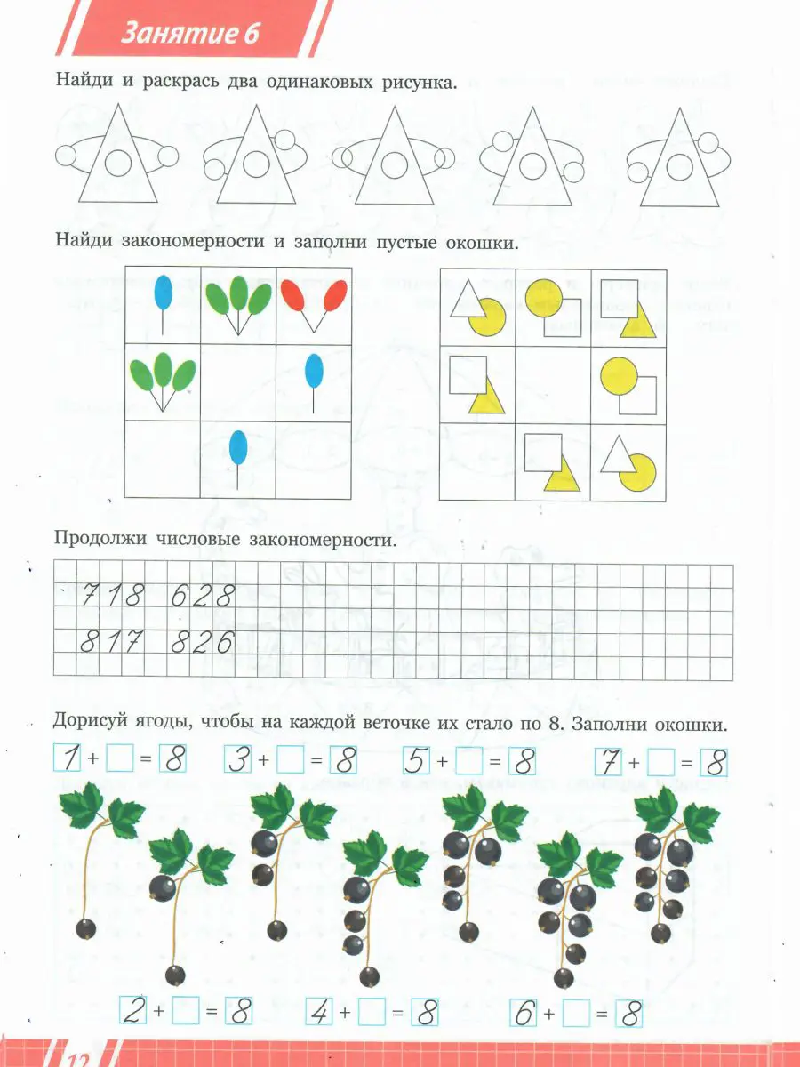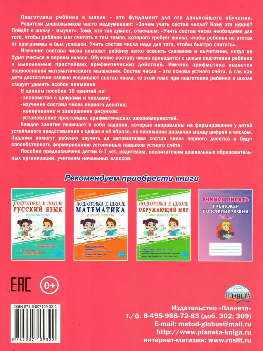 В данном пособии 10 занятий на: - знакомство с цифрами и числами; - изучение состава чисел...
