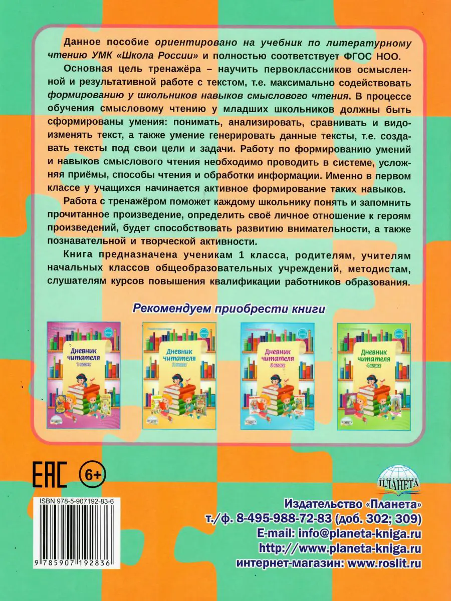 Основная цель тренажёра – научить первоклассников осмысленной и результативной работе с текстом, т.е. максимально содействовать формированию у школьников навыков смыслового чтения. В процессе обучения смысловому чтению у младших школьников должны быть сформированы умения: понимать, анализировать, сравнивать и видоизменять текст, а также умение генерировать данные тексты, т.е. создавать тексты под свои цели и задачи. Работу по формированию умений и навыков смыслового чтения необходимо проводить в системе, усложняя приёмы, способы чтения и обработки информации. Именно в первом классе у учащихся начинается активное формирование таких навыков.
