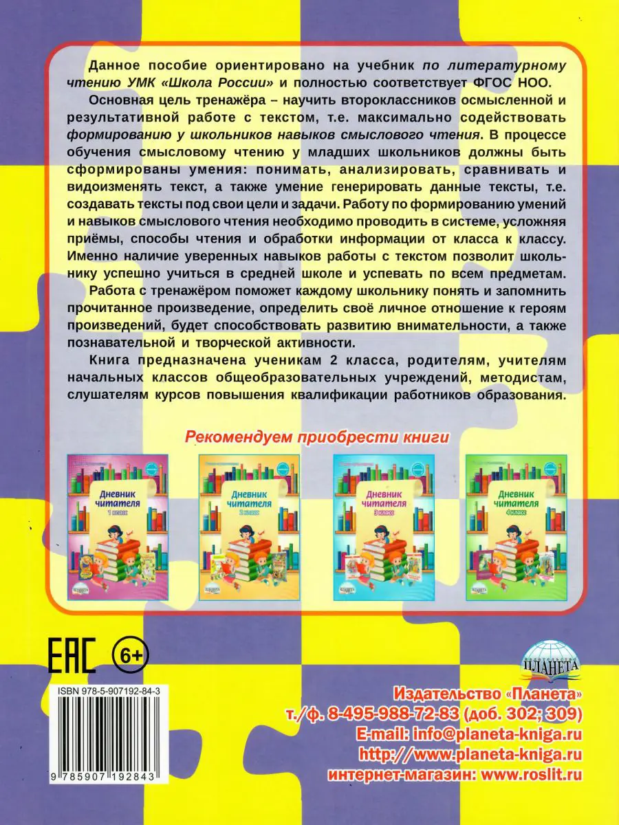 Основная цель тренажёра – научить второклассников осмысленной и результативной работе с текстом, т.е. максимально содействовать формированию у школьников навыков смыслового чтения. В процессе обучения смысловому чтению у младших школьников должны быть сформированы умения: понимать, анализировать, сравнивать и видоизменять текст, а также умение генерировать данные тексты, т.е. создавать тексты под свои цели и задачи. Работу по формированию умений и навыков смыслового чтения необходимо проводить в системе, усложняя приёмы, способы чтения и обработки информации от класса к классу. Именно наличие уверенных навыков работы с текстом позволит школьнику успешно учиться в средней школе и успевать по всем предметам.