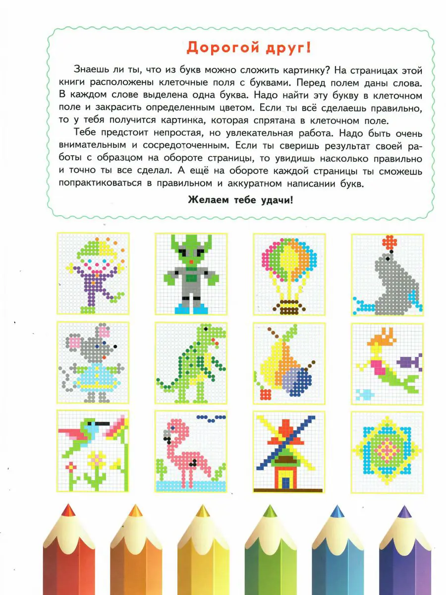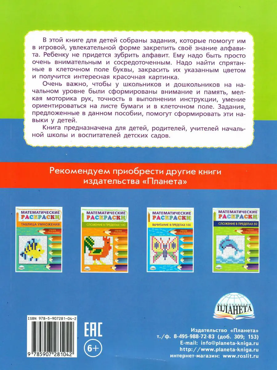 В этой книге для детей собраны задания, которые помогут им в игровой, увлекательной форме закрепить своё знание алфавита. Ребенку не придется зубрить алфавит. Ему надо быть просто очень внимательным и сосредоточенным. Надо найти спрятанные в клеточном поле буквы, закрасить их указанным цветом и получится интересная красочная картинка.