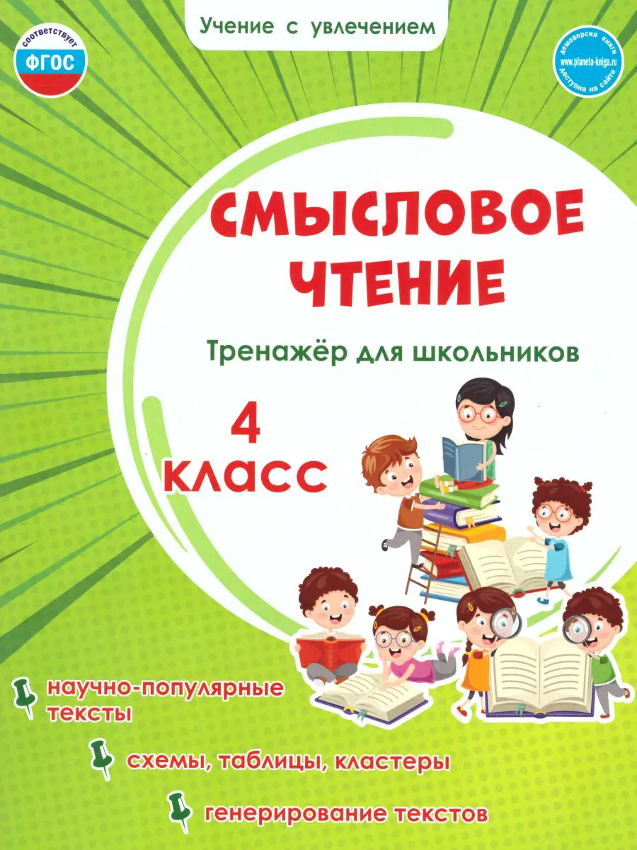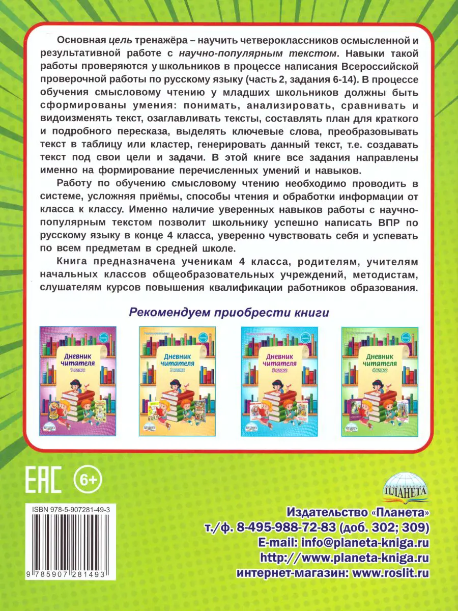 Основная цель тренажёра – научить четвероклассников осмысленной и результативной работе с научно-популярным текстом. Навыки такой работы проверяются у школьников в процессе написания Всероссийской проверочной работы по русскому языку (часть 2, задания 6-14). В процессе обучения смысловому чтению у младших школьников должны быть сформированы умения: понимать, анализировать, сравнивать и видоизменять текст, озаглавливать тексты, составлять план для краткого и подробного пересказа, выделять ключевые слова, преобразовывать текст в таблицу или кластер, генерировать данный текст, т.е. создавать текст под свои цели и задачи. В этой книге все задания направлены именно на формирование перечисленных умений и навыков.