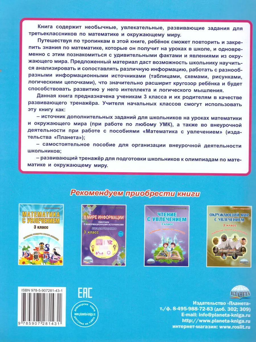 Книга содержит необычные, увлекательные, развивающие задания для третьеклассников по математике и окружающему миру.