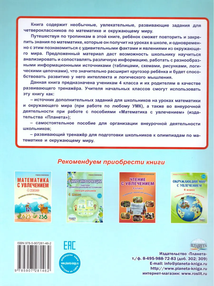 Книга содержит необычные, увлекательные, развивающие задания для четвероклассников по математике и окружающему миру.