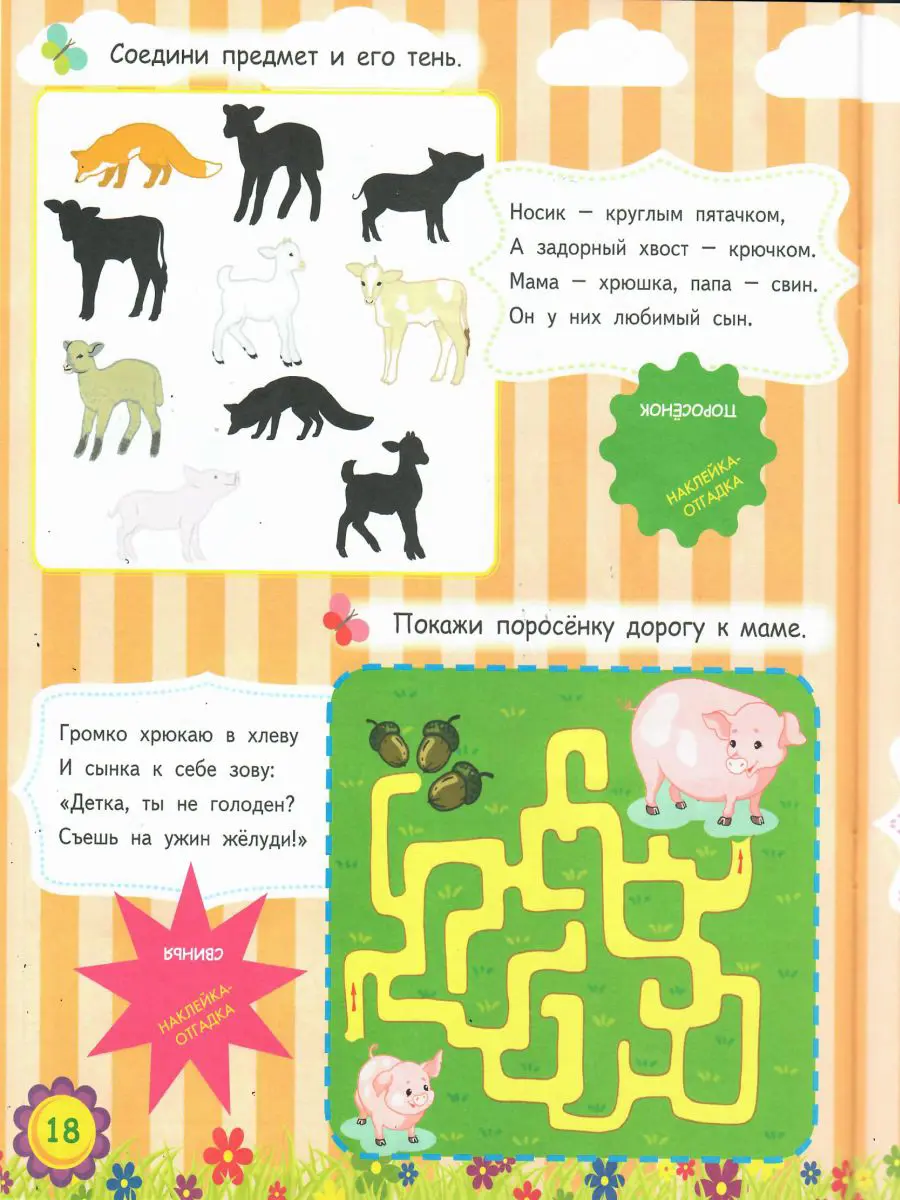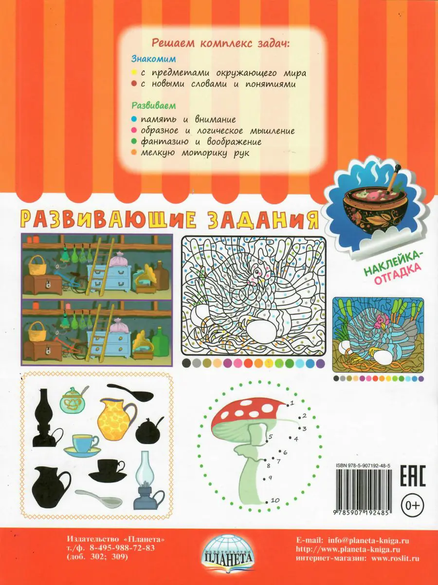 Загадки дополнены заданиями, развивающими внимание, память, логическое и образное мышление (отгадки-наклейки, зашумленные картинки, раскраски с цветовыми подсказками, дорисовка предметов по точкам и клеточкам, поиски изображений по фрагментам картинки, силуэтам, общей тематике).
