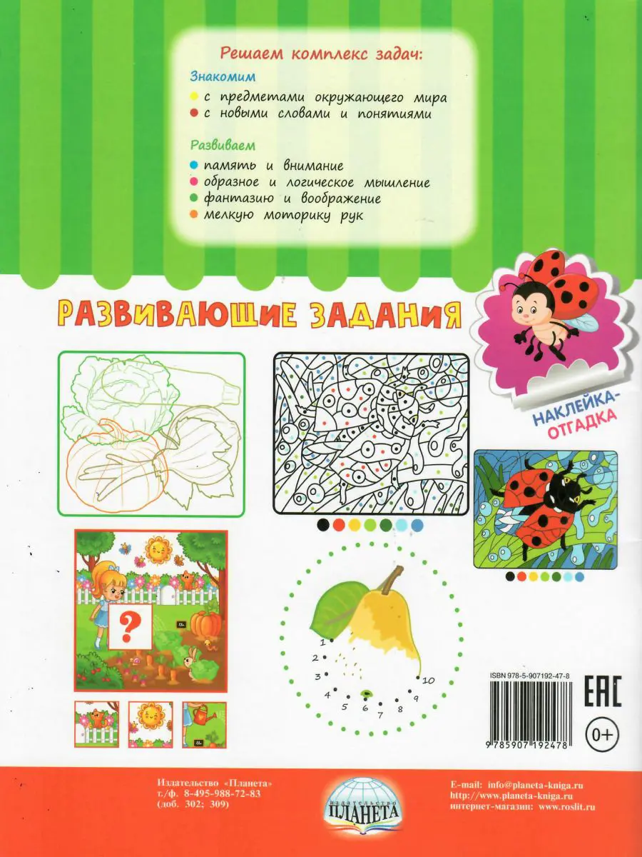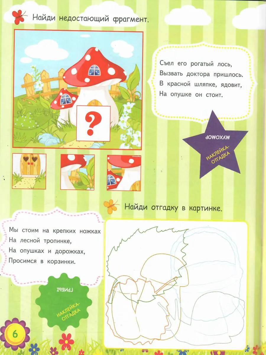 Загадки дополнены заданиями, развивающими внимание, память, логическое и образное мышление (отгадки-наклейки, зашумленные картинки, раскраски с цветовыми подсказками, дорисовка предметов по десяти точкам, поиски изображений по фрагменту картинки).