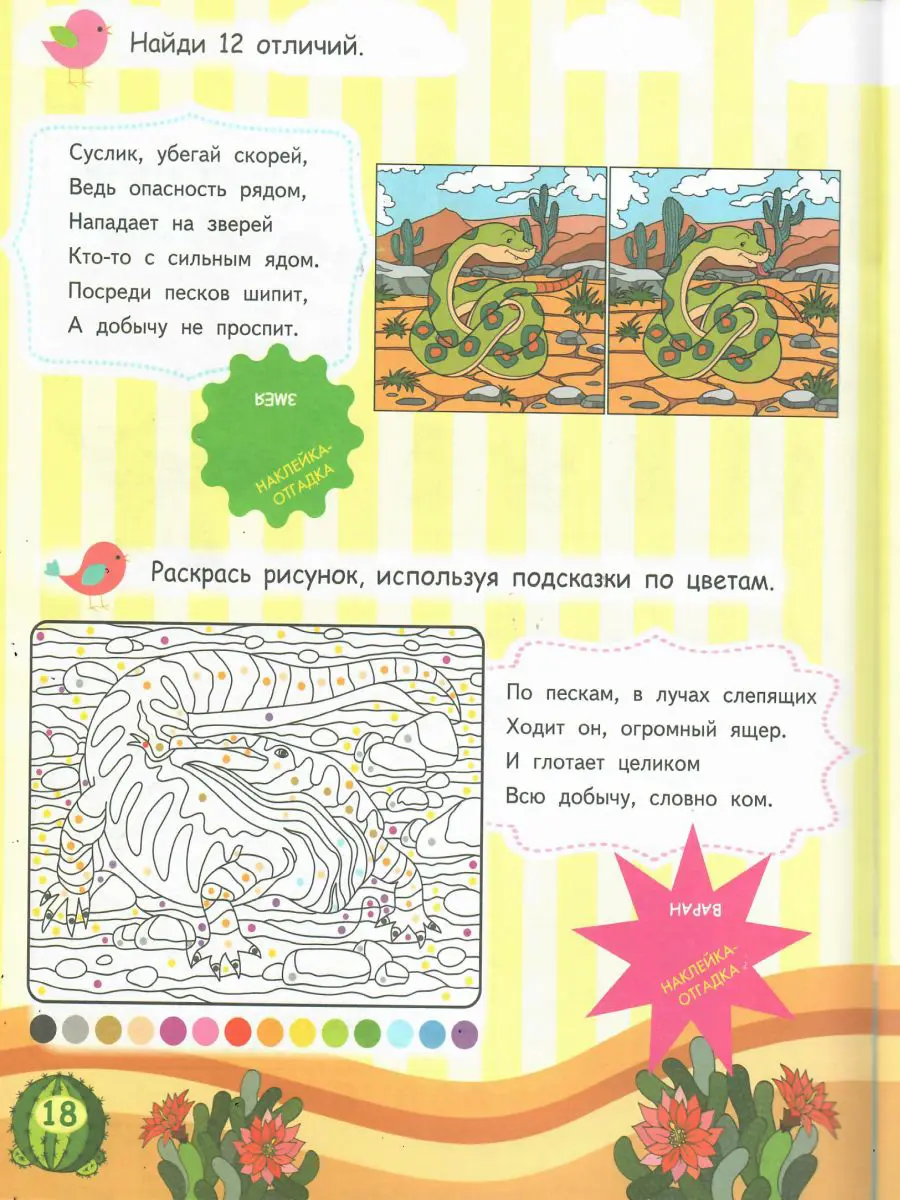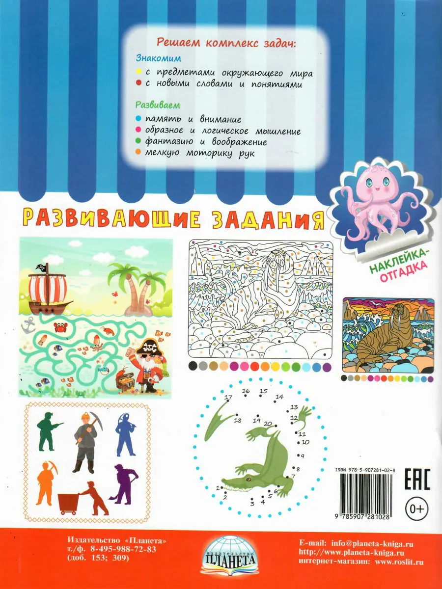Загадки дополнены заданиями, развивающими внимание, память, логическое и образное мышление (отгадки-наклейки, зашумленные картинки, раскраски с цветовыми подсказками, дорисовка предметов по десяти точкам, поиски изображений по фрагменту картинки).