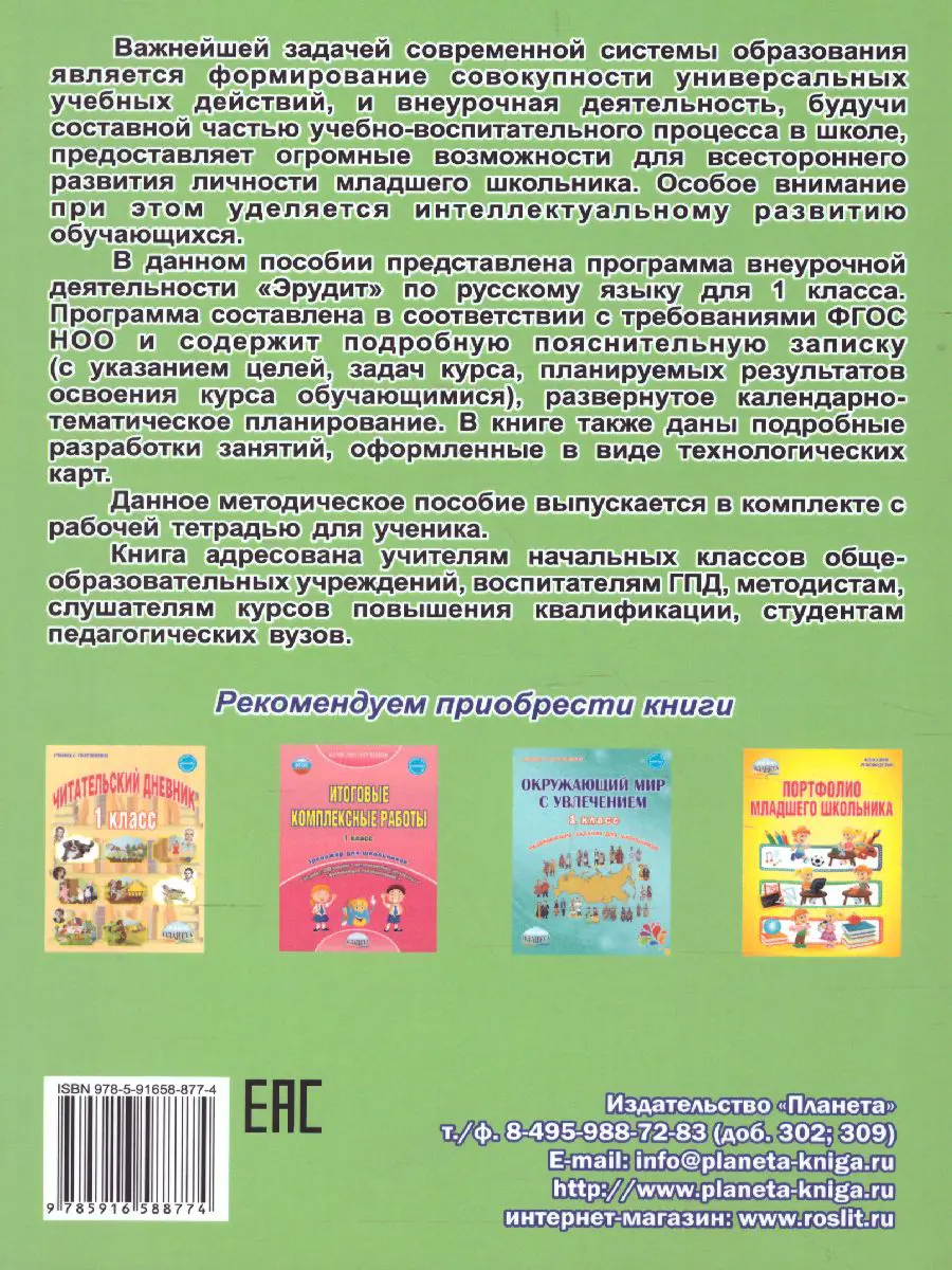 В данном пособии представлена программа внеурочной деятельности «Эрудит» по русскому языку для 1 класса. Программа составлена в соответствии с требованиями ФГОС НОО и содержит подробную пояснительную записку (с указанием целей, задач курса, планируемых результатов освоения курса обучающимися), развернутое календарно-тематическое планирование. В книге также даны подробные разработки занятий, оформленные в виде технологических карт.