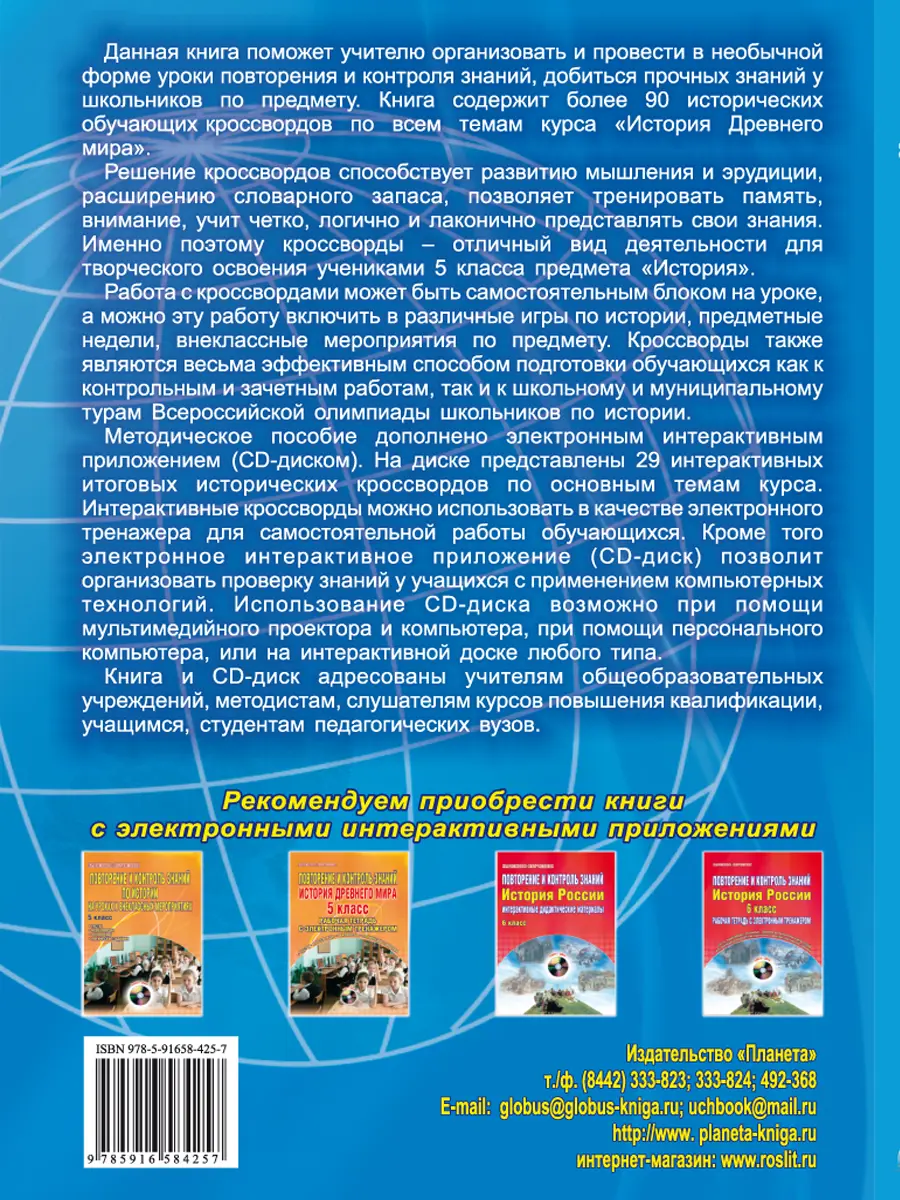 Методическое пособие дополнено электронным интерактивным приложением (СD-диском). На диске представлены 29 интерактивных итоговых исторических кроссвордов по основным темам курса. Интерактивные кроссворды можно использовать в качестве электронного тренажера для самостоятельной работы обучающихся. Кроме того электронное интерактивное приложение (СD-диск) позволит организовать проверку знаний у учащихся с применением компьютерных технологий. Использование СD-диска возможно при помощи мультимедийного проектора и компьютера, при помощи персонального компьютера, или на интерактивной доске любого типа.