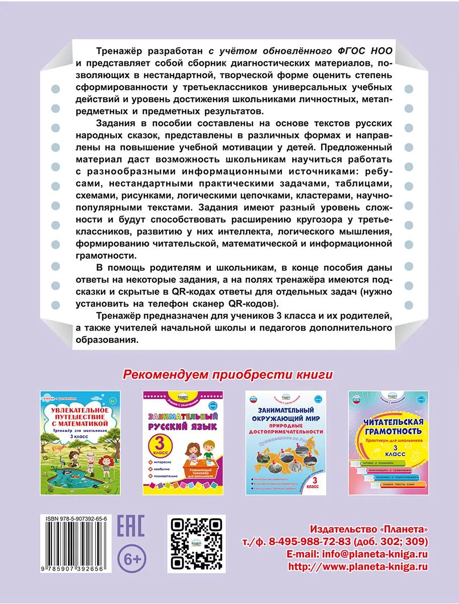 Тренажёр разработан с учётом обновлённого ФГОС НОО и представляет собой сборник диагностических материалов, позволяющих в нестандартной, творческой форме оценить степень сформированности у третьеклассников универсальных учебных действий и уровень достижения школьниками личностных, метапредметных и предметных результатов.