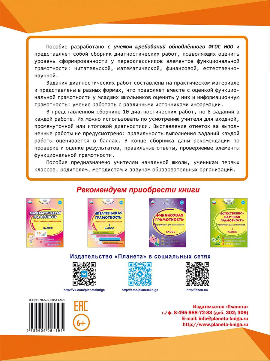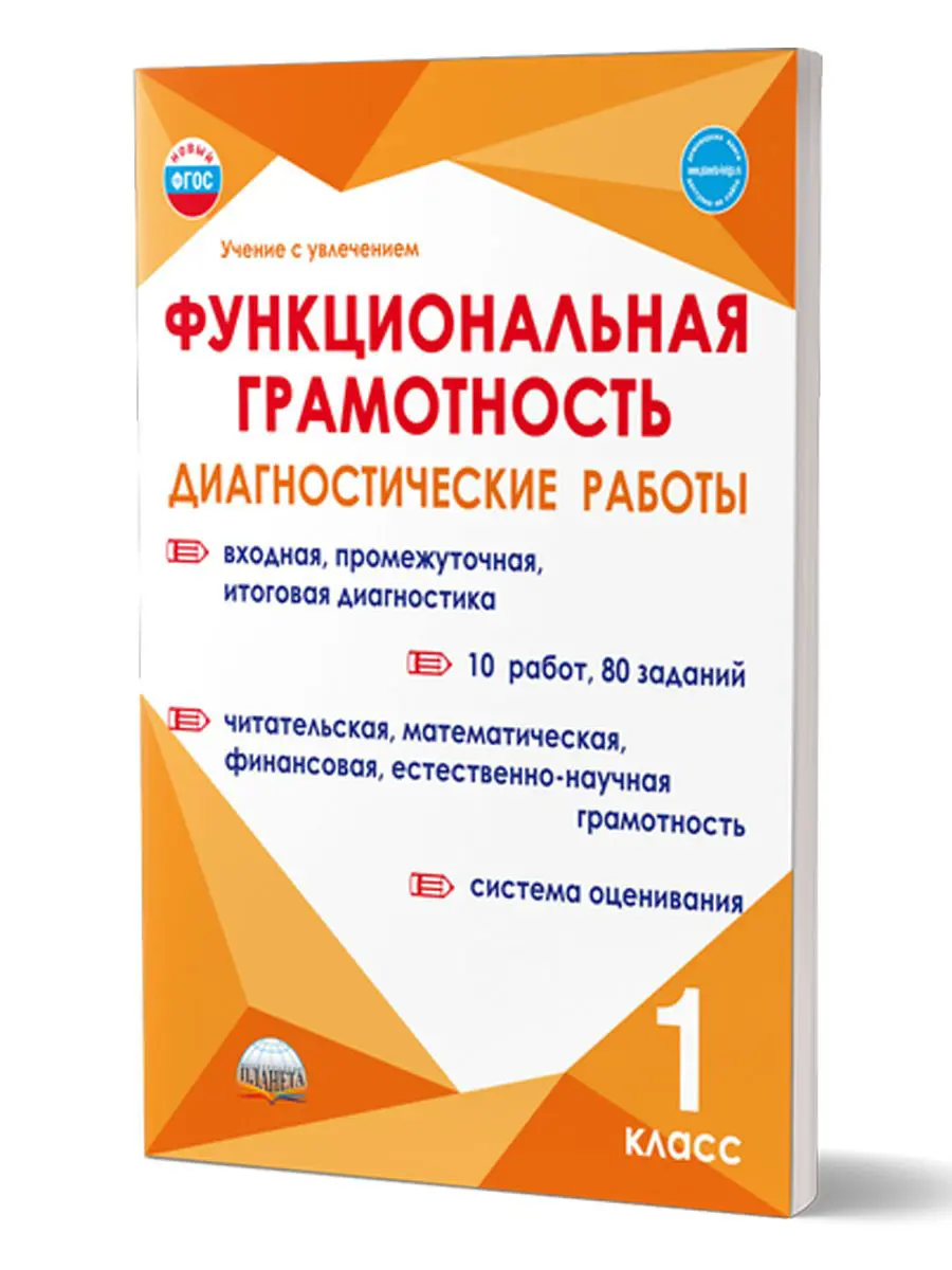 Пособие разработано с учетом требований обновлённого ФГОС НОО и представляет собой сборник диагностических работ, позволяющих оценить уровень сформированности у первоклассников элементов функциональной грамотности: читательской, математической, финансовой, естественно-научной.