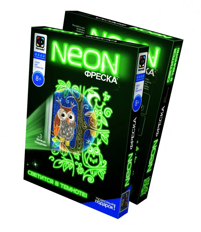 Эта фреска получила еще одно чудесное качество - теперь она светится в темноте! Светящаяся картина, которую можно сделать своими руками, обязательно понравится! вашему малышу! Простая техника изготовления интересный сюжет и необычные материалы сделаю творческий процесс веселым и увлекательным. Малыш будет усердно трудиться над своим первым шедевром, попутно овладевая полезными навыками. А ночью с его картиной начнут происходить необыкновенные вещи! Небо из дневного станет ночным, окошки в домах зажгутся, месяц будет освещать не только картину, но и комнату волшебным синим светом. Приятно делать чудеса своими руками! Уникальная технология с использованием неонового порошка. В набор входит: трехслойная основа с высеченным трафаретом, набор цветного песка, люминофор, заготовка рамки, деревянный стик, кисточка, бумажная салфетка, подробная инструкция. Для детей от 8 -лет.