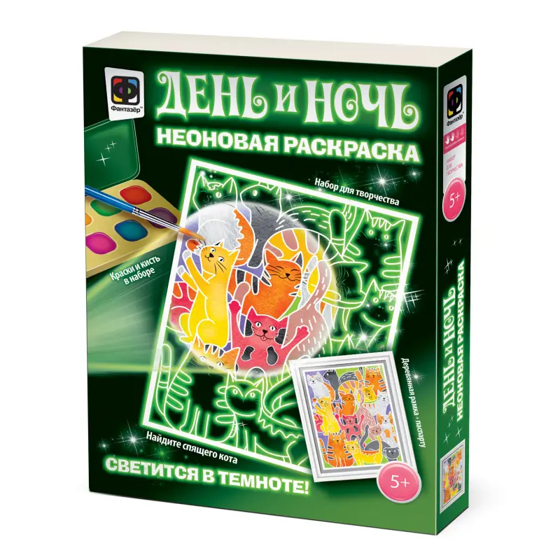 В наборе: бумага с нанесенным неоновым контуром, краски акварельные, кисточка, краска акриловая для рамки, бумажное паспарту, деревянная рамка.