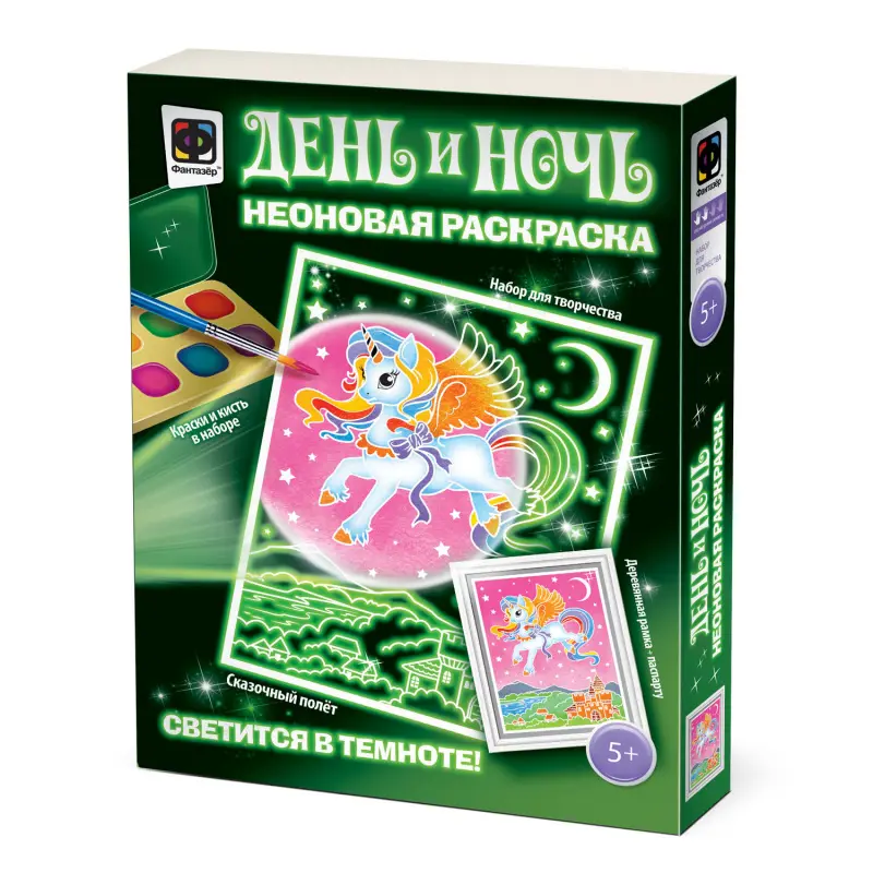 Наша волшебная акварель получила ещё одно свойство - она светится в темноте! Внутри упаковки вы найдёте акварельные краски и лист для раскрашивания со специальным контуром. Этот контур незатекаемый для краски, поэтому вы смело можете раскрашивать картинку либо как захочется по цвету, либо вообще радужной заливкой. Контур всё равно проявится и сделает картинку красивой. Помимо этого, если посмотреть на картинку ночью, контур начнет светиться и превратит её в настоящее чудо - она будет светиться в темноте! И даже если она потом погаснет не расстраивайтесь! Утром зарядите её новой порцией света! В наборе: бумага с нанесенным неоновым контуром, краски акварельные, кисточка, краска акриловая для рамки, бумажное паспарту, деревянная рамка. Рекомендовано для детей от 5-ти лет.