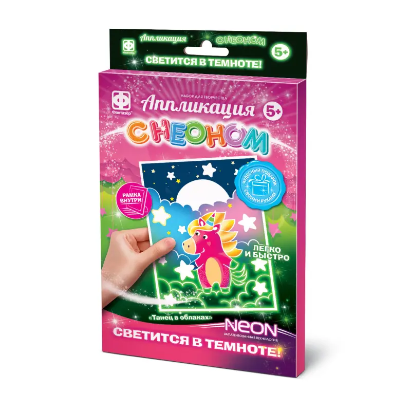 Такую картинку с фантастическим свойством, а именно свечением в темноте, может сделать любой ребенок! Нужно лишь с помощью деревянной шпажки снять защитный слой бумаги на всех деталях зеленоватого цвета и кисточкой нанести неоновый порошок на все открытые участки. В наборе есть и рамка, чтобы придать произведению законченный вид. Эти поделки доступны самым маленьким творцам! И они точно полу-чат удовольствие от процесса! А также от результата!