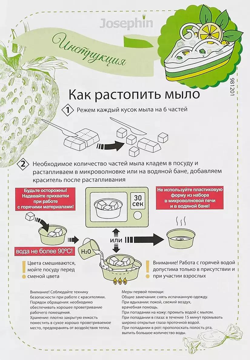 Набор для творчества. Создание оригинального мыла с помощью мыльной основы, ярких красителей и сочного ароматизатора. Если ты романтичная и творческая натура, то этот набор для тебя!Это не пирожное, это - Мыло-пирожное! Его так и хочется съесть, что мы делать не советуем, а еще больше - сделать своими руками. Оно получится восхитительно правдоподобным, ароматным и "вкусным". Масса удовольствия и никаких диет после! Подойдёт сластенам всех возрастов! В наборе есть всё необходимое для изготовления мыла, а также подробная инструкция с иллюстрациями. Желаем Вам получить удовольствие как от самого процесса изготовления, так и от результата.