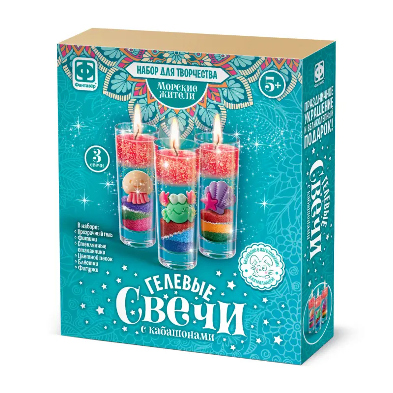 Набор для создания гелевых свечей с кабошонами понравится и детям и взрослым! В наборе: 3 стеклянных стаканчика, цветной песок, блёстки, 3 фигурки, гель прозрачный и цветной, 3 фитиля, ложка и инструкция. Свечи, сделанные своими руками, украсят интерьер и послужат замечательным подарком родным и близким!