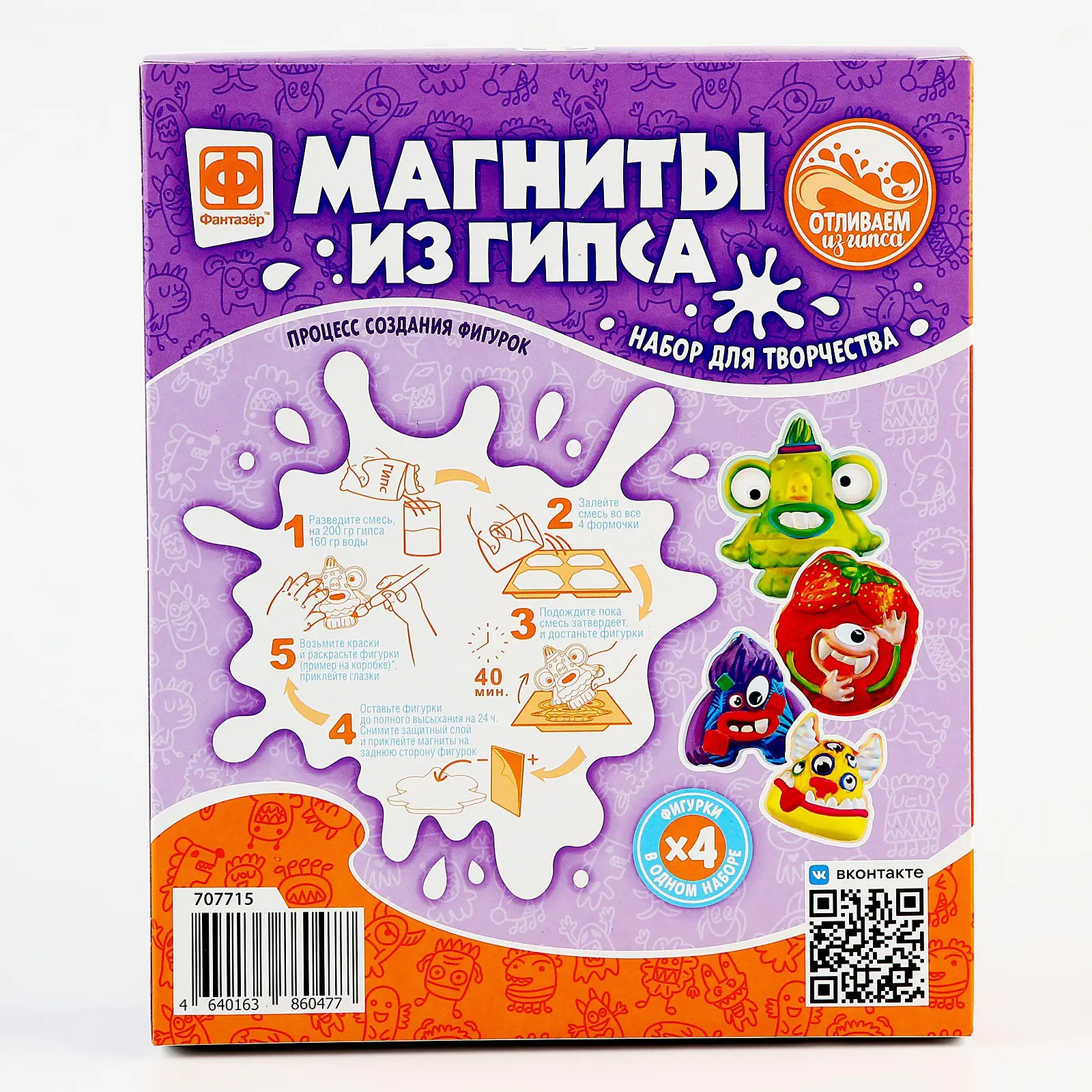 Набор Магниты из гипса позволит ребёнку создать красивое украшение интерьера или оригинальный подарок родным и друзьям.Работа с набором развивает творческие способности, воображение, внимание, мелкую моторику и усидчивость. Состав набора: форма для отливки, гипс, краски акриловые, кисть, магнитная лента. Инструкция напечатана на коробке.Для детей от 5 лет под наблюдением взрослых.