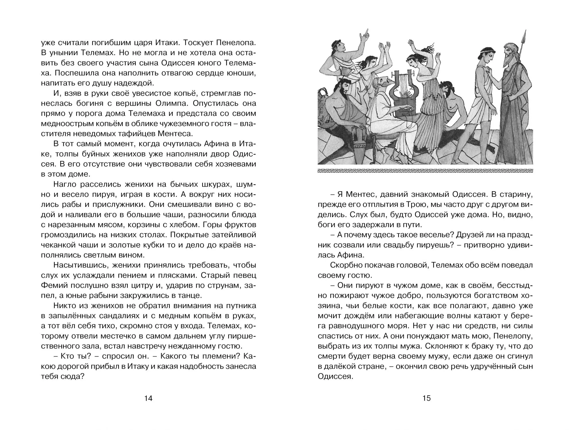 Эта книга, основанная на древних мифах, повествует о долгих странствиях хитроумного царя Одиссея, который по окончании Троянской войны возвращается домой на остров Итаку, где его ждут жена Пенелопа и сын Телемах. По дороге он преодолевает немало препятствий: плен у циклопа Полифема, бурю Эоловых ветров, коварный пролив между Сциллой и Харибдой.
