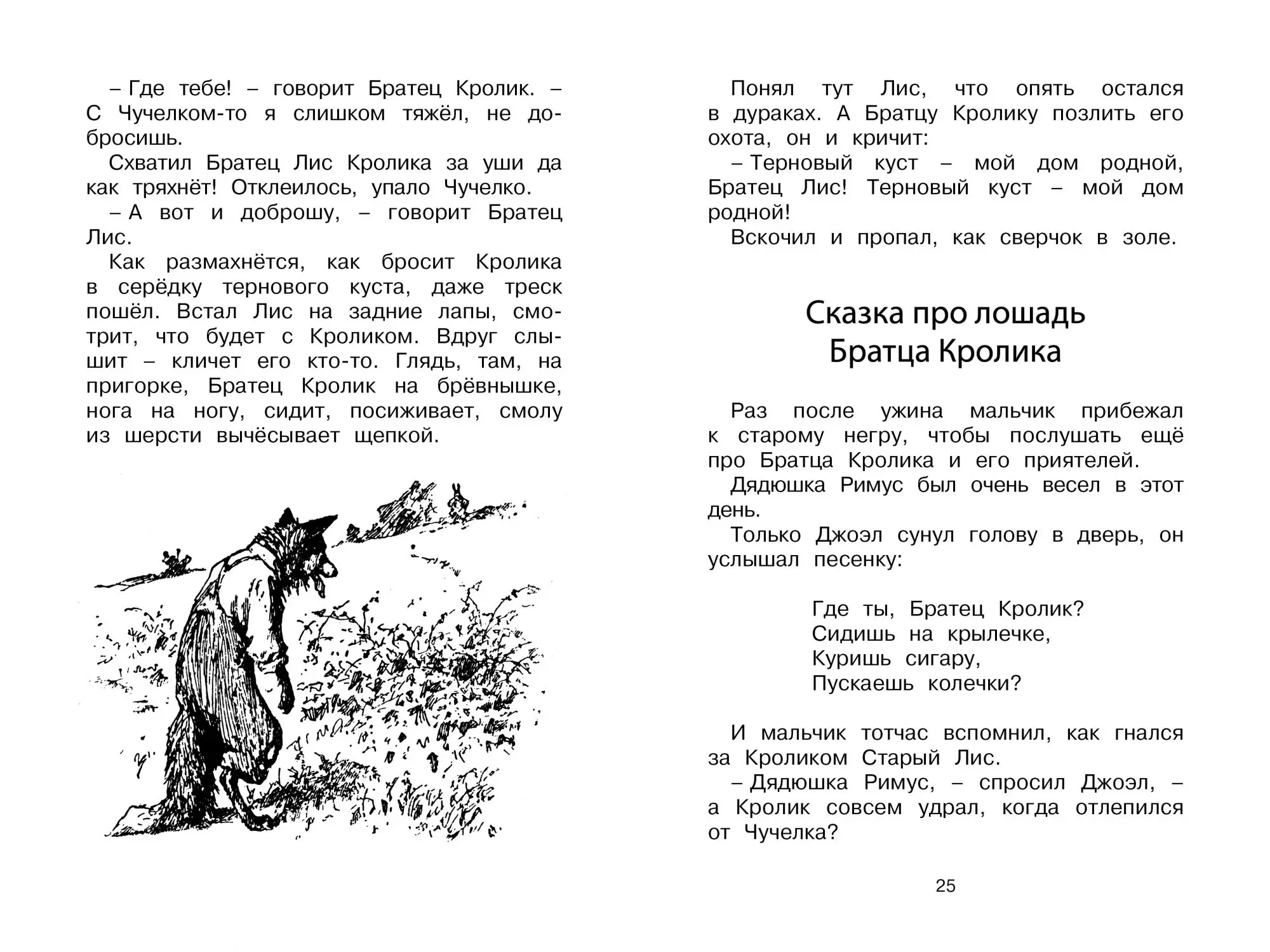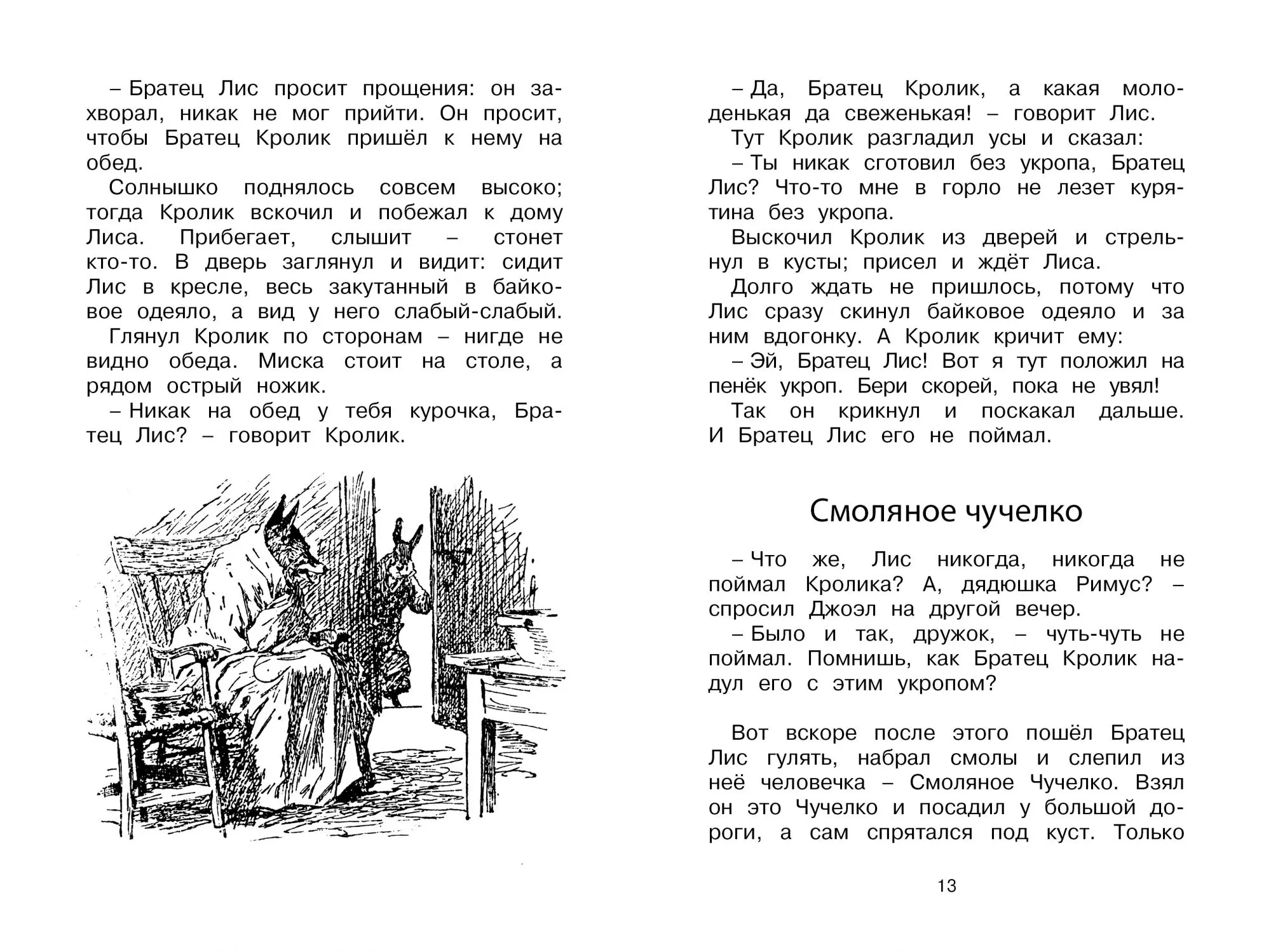 Герой этих весёлых и смешных сказок – Братец Кролик, затейник, каких поискать! Из всех передряг он выйдет сухим из воды. Ни Братец Лис, ни Братец Черепаха, ни Братец Медведь, – никто ему и в подмётки не годится. Когда-то истории о проделках зверей были рассказаны дядюшкой Римусом своему маленькому другу мальчику Джоэлу, который впоследствии стал известным детским писателем и фольклористом Джоэлом Чандлером Харрисом.