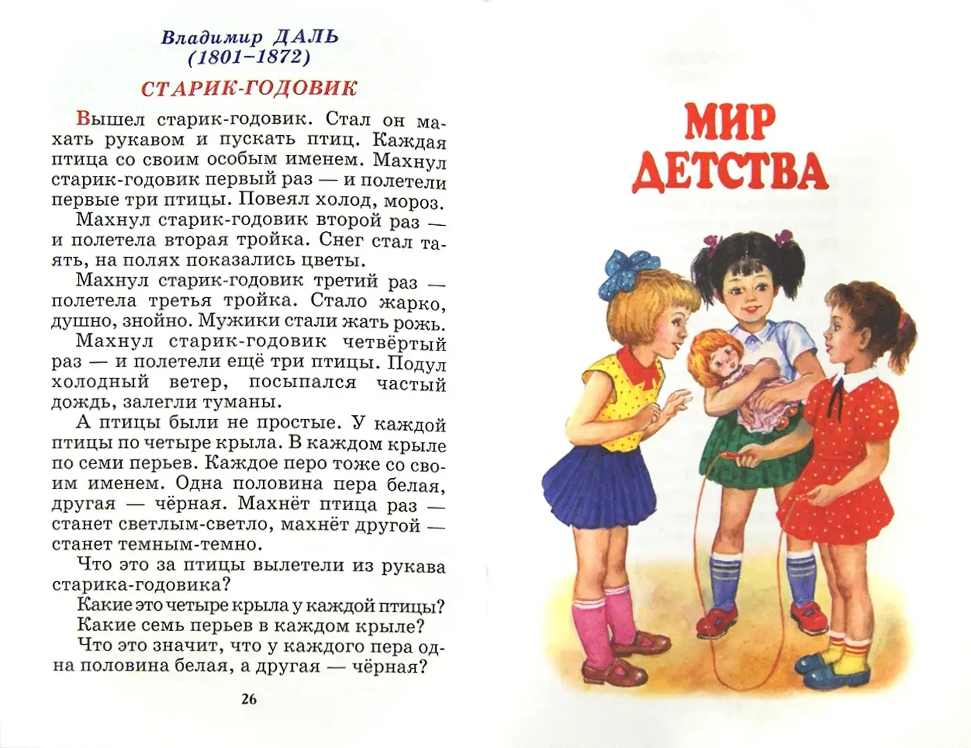 В сборник вошли произведения: А. Пушкина, Н. Некрасова, В. Осеевой, В. Даля, Б. Житкова, Л. Толстого, К. Ушинского, А. Плещеева, С. Есенина И. Сурикова, В. Жуковского, Г. Скребицкого, В. Гаршина, М. Цветаевой, X. К. Андерсена, Н. Гарина-Михайловского.