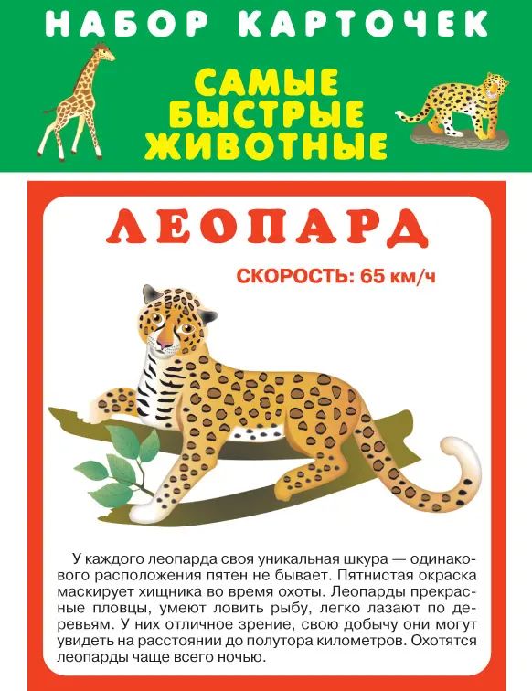Ребенок узнает, какие животные самые быстрые, запомнит их названия. На каждой карточке познавательная информация о животном. В наборе 20 карточек. Для детей дошкольного возраста.