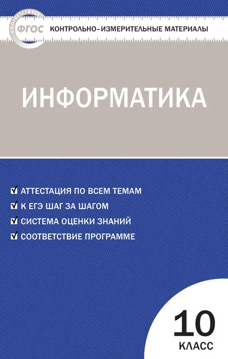 В пособии представлены контрольно-измерительные материалы (КИМы) по информатике для 10 класса. Издание составлено в соответствии с требованиями ФГОС. Структура КИМов аналогична структуре заданий ЕГЭ, что позволит постепенно подготовить учащихся к работе с подобным материалом. В конце издания предложены ответы к тестам.