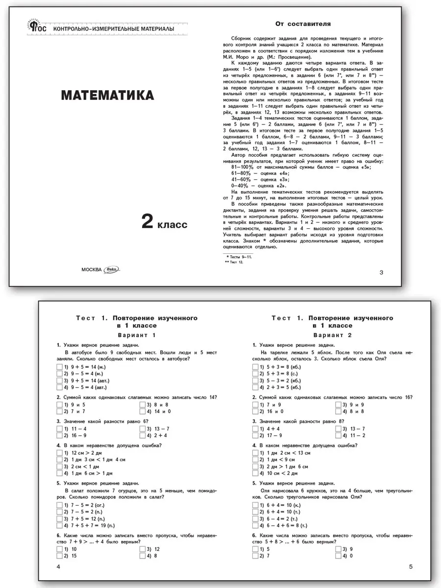 В пособии представлены контрольно-измерительные материалы по математике для 2 класса. Порядок тем соответствует учебнику М.И. Моро и др. УМК «Школа России», входящему в действующий федеральный перечень учебников. Все задания соответствуют программе общеобразовательных организаций и требованиям действующего ФГОС для начальной школы. Систематическая работа с материалами сборника позволит обучить школьников работе с тестами, что поможет в дальнейшем успешно выполнить задания государственной аттестации. Издание адресовано учителям начальных классов, школьникам и их родителям.
