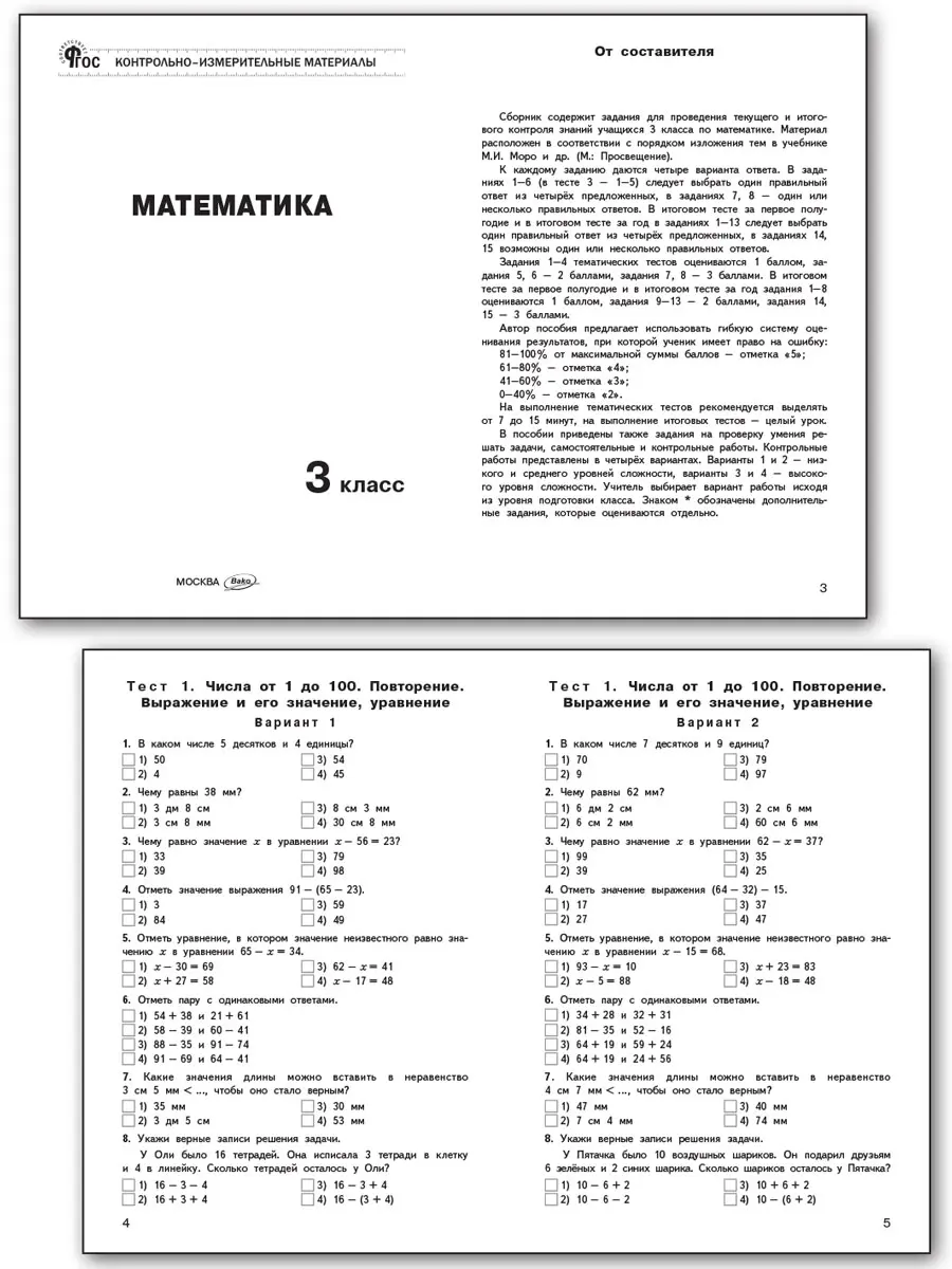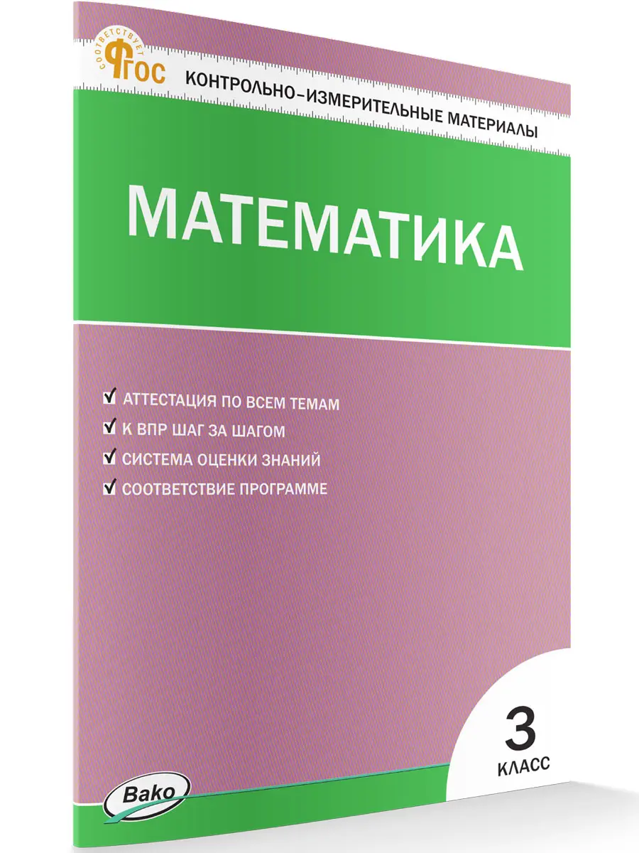 В пособии представлены контрольно-измерительные материалы по математике для 3 класса. Порядок тем соответствует учебнику М.И. Моро и др. УМК «Школа России», входящему в действующий федеральный перечень учебников. Все задания соответствуют программе общеобразовательных организаций и требованиям действующего ФГОС для начальной школы. Систематическая работа с материалами сборника позволит обучить школьников работе с тестами, что поможет в дальнейшем успешно выполнить задания государственной аттестации. Издание адресовано учителям начальных классов, школьникам и их родителям.