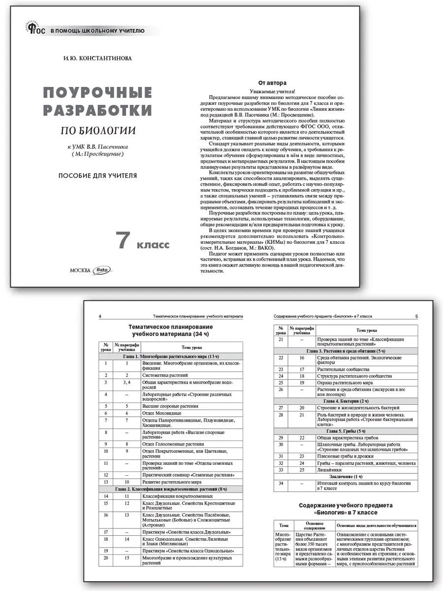 В пособии представлены поурочные разработки к учебнику по биологии для 7 класса под редакцией В.В. Пасечника (М.: Просвещение), который входит в действующий федеральный перечень учебников (приказ Минпросвещения России от 21.09.2022 № 858) и является частью УМК по биологии «Линия жизни» (5–9 классы). Материал соответствует требованиям действующих ФГОС и ФОП ООО (приказ Минпросвещения России от 18.05.2023 № 370). Учитель найдёт здесь весь необходимый для проведения полноценных занятий материал: конкурсы, творческие задания, методические советы и рекомендации, интересную дополнительную информацию, вопросы и задания для устных и письменных ответов учащихся. Издание адресовано учителям, студентам педагогических вузов и колледжей.