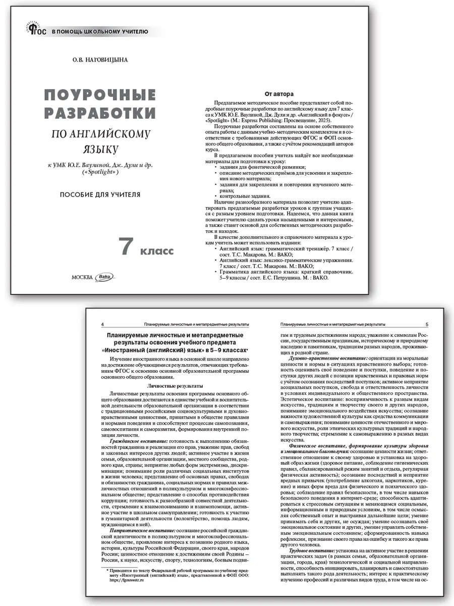 Поурочные методические разработки составлены по учебнику Ю.Е. Ваулиной, Дж. Дули и др. «Английский в фокусе» / «Spotlight» (М.: Express Publishing: Просвещение), входящему в действующий федеральный перечень учебников (приказ Минпросвещения России от 21.09.2022 № 858). Материал соответствует требованиям действующих ФГОС и ФОП ООО (приказ Минпросвещения России от 18.05.2023 № 370). Учитель найдёт здесь всё необходимое для подготовки к уроку: тематическое планирование учебного материала, подробные сценарии уроков, методические рекомендации по организации работы учащихся, контрольные задания и многое другое. Издание адресовано преподавателям английского языка, студентам педагогических вузов и колледжей. Подходит к учебникам «Английский язык» в составе УМК Н.И. Быковой, Дж. Дули, О.Е. Подоляко и др., выпущенным с 2023 г. по н. в.