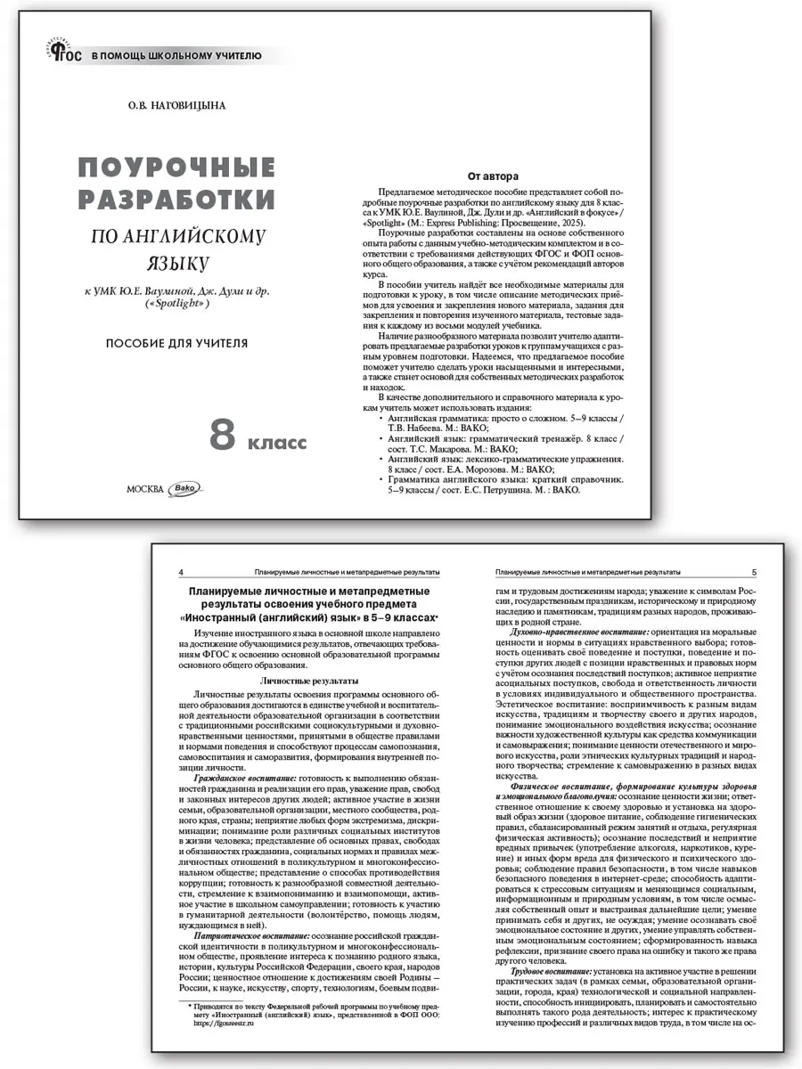Поурочные методические разработки составлены по учебнику Ю.Е. Ваулиной, Дж. Дули и др. «Английский в фокусе» / «Spotlight» (М.: Express Publishing: Просвещение), входящему в действующий федеральный перечень учебников (приказ Минпросвещения России от 21.09.2022 № 858). Материал соответствует требованиям действующих ФГОС и ФОП ООО (приказ Минпросвещения России от 18.05.2023 № 370). Учитель найдет здесь всё необходимое для подготовки к каждому уроку: тематическое планирование учебного материала, подробные сценарии уроков, методические рекомендации по организации работы учащихся, контрольные задания и многое другое. Издание адресовано преподавателям английского языка, студентам педагогических вузов и колледжей.