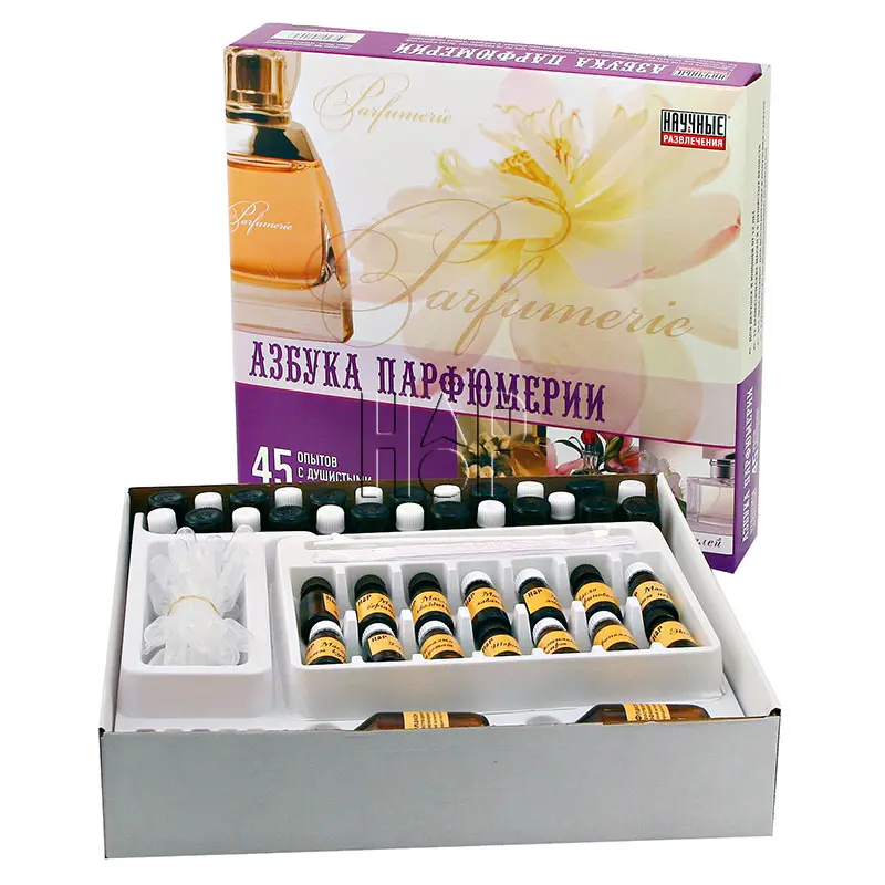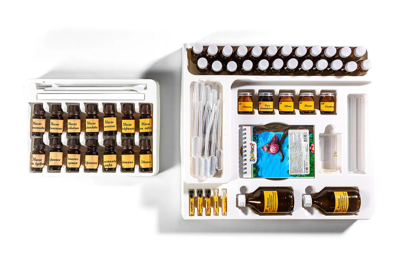 В набор входят более десятка эфирных масел, синтетические душистые вещества, флаконы, пипетки и необходимые парфюмерные растворы. Набор научит управлять запахами и создавать свои уникальные ароматы.