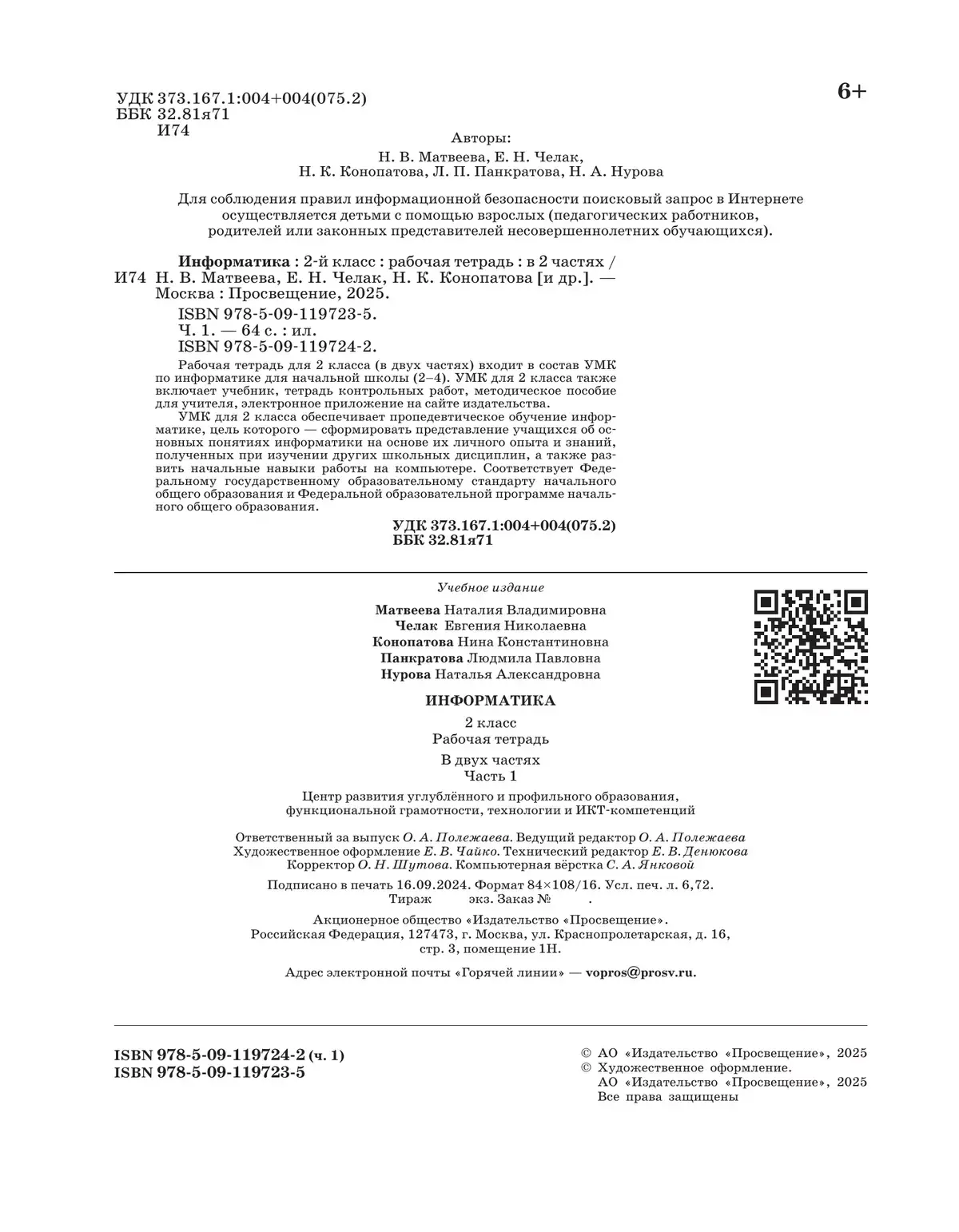 Рабочая тетрадь для 2 класса (в двух частях) входит в состав УМК по информатике для начальной школы (2–4). УМК для 2 класса также включает учебник, тетрадь контрольных работ, методическое пособие для учителя.