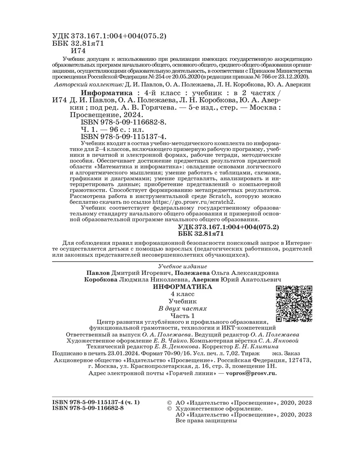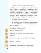 Учебник соответсвует ФГОС 2021 г. Учебник входит в состав учебно-методического комплекта по информатике для 2–4 классов, включающего примерную рабочую программу, учебники в печатной и электронной формах, рабочие тетради, методические пособия. Обеспечивает достижение предметных результатов предметной области «Математика и информатика»: овладение основами логического и алгоритмического мышления; умение работать с таблицами, схемами, графиками и диаграммами; умение представлять, анализировать и интерпретировать данные; приобретение первоначальных представлений о компьютерной грамотности.