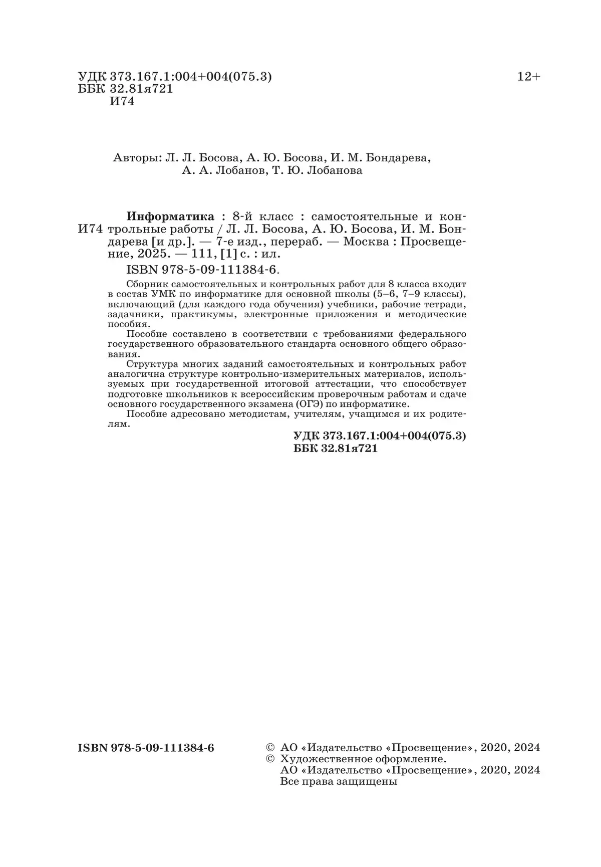 Сборник самостоятельных и контрольных работ для 8 класса входит в состав УМК по информатике для основной школы (5–6, 7–9 классы), включающий (для каждого года обучения) учебники, рабочие тетради, задачники, практикумы, электронные приложения и методические пособия.