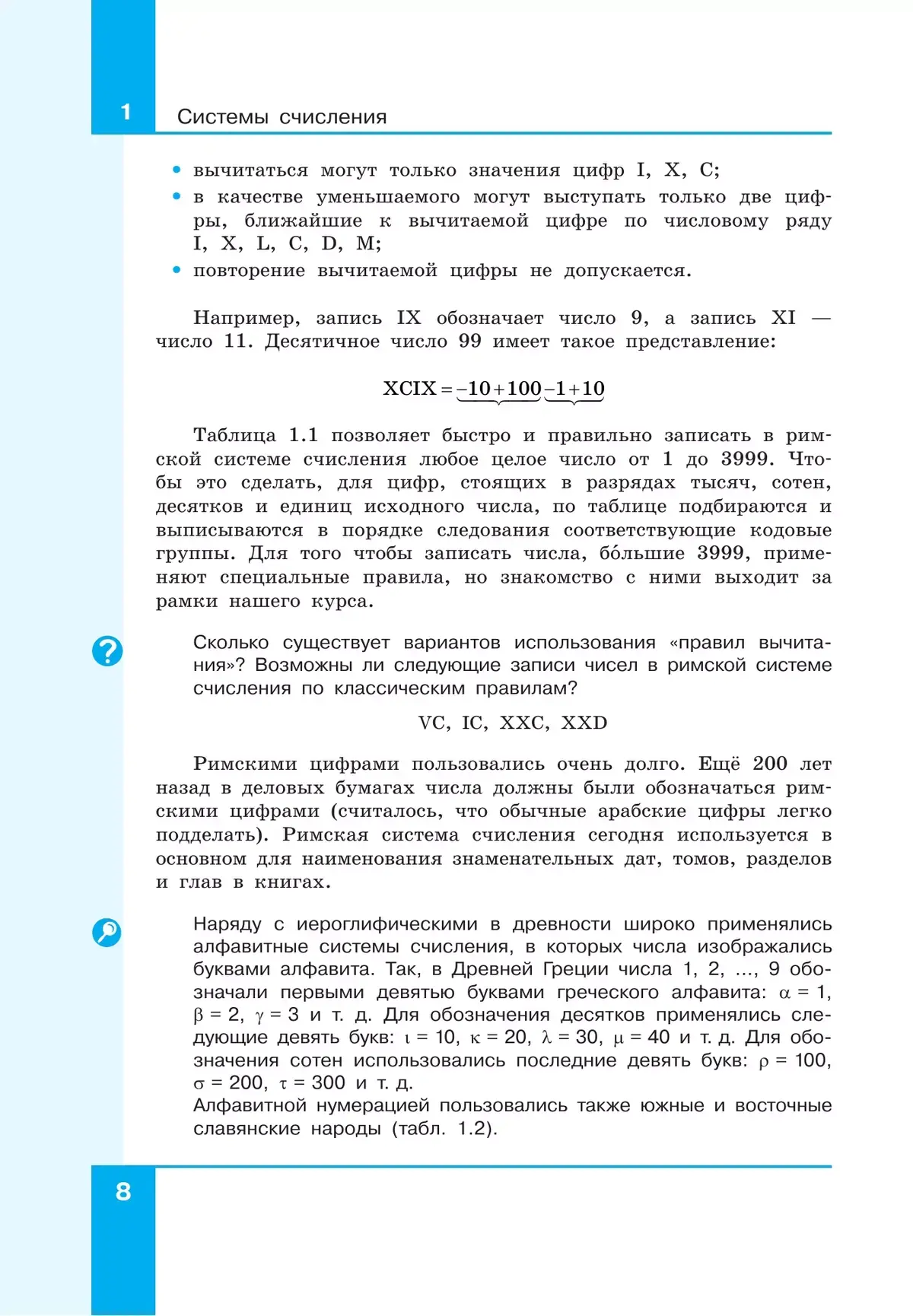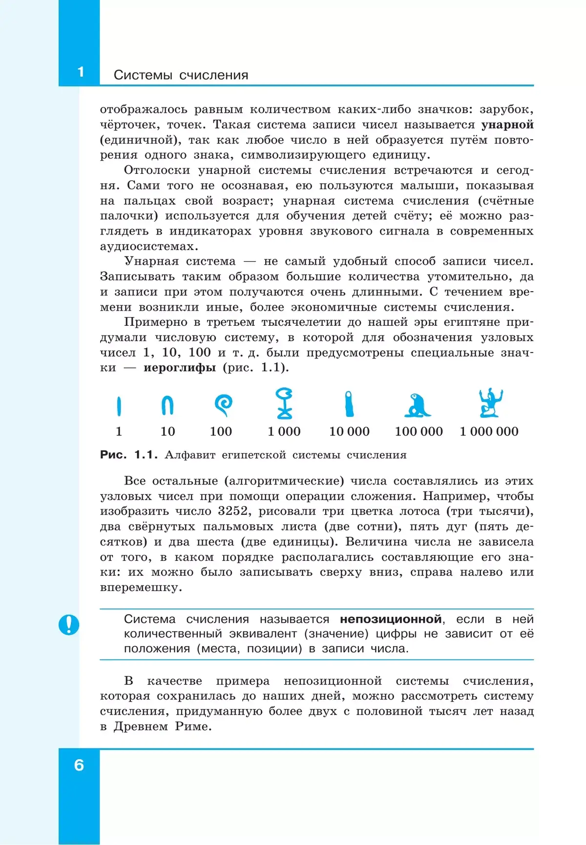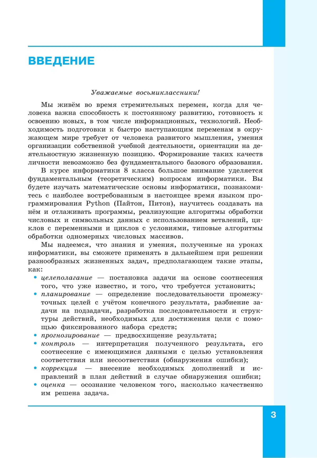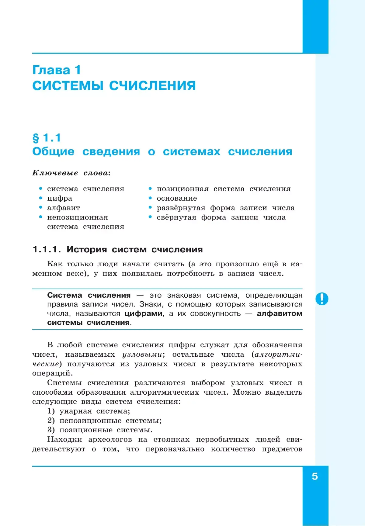 Содержание учебника структурировано по темам «Системы счисления», «Элементы математической логики» (тематический раздел «Теоретические основы информатики»), «Начало программирования на языке Python» (тематический раздел «Алгоритмы и программирование»), «Обработка числовой информации в электронных таблицах» (тематический раздел «Информационные технологии»).