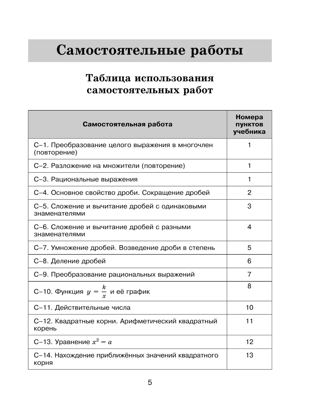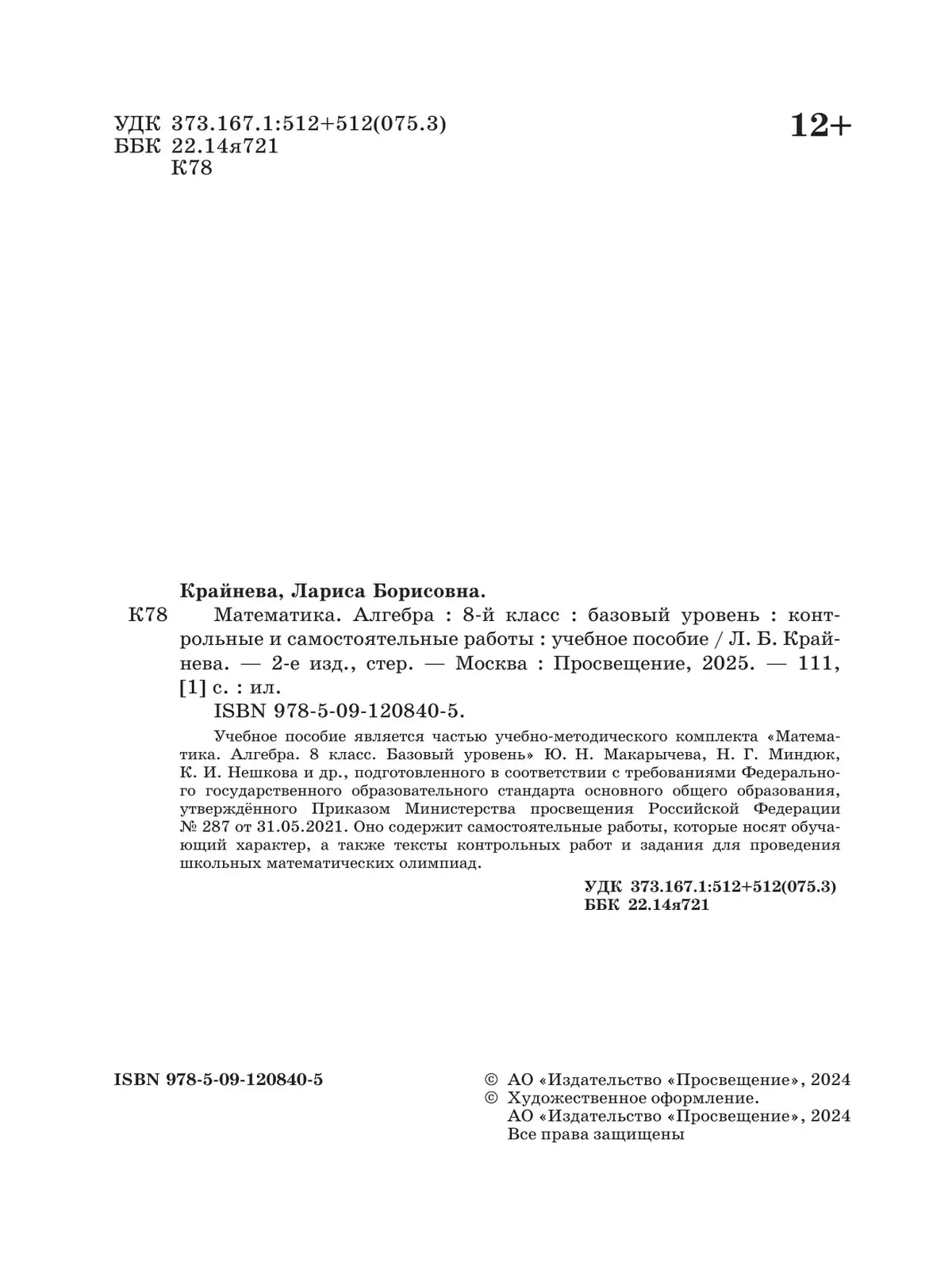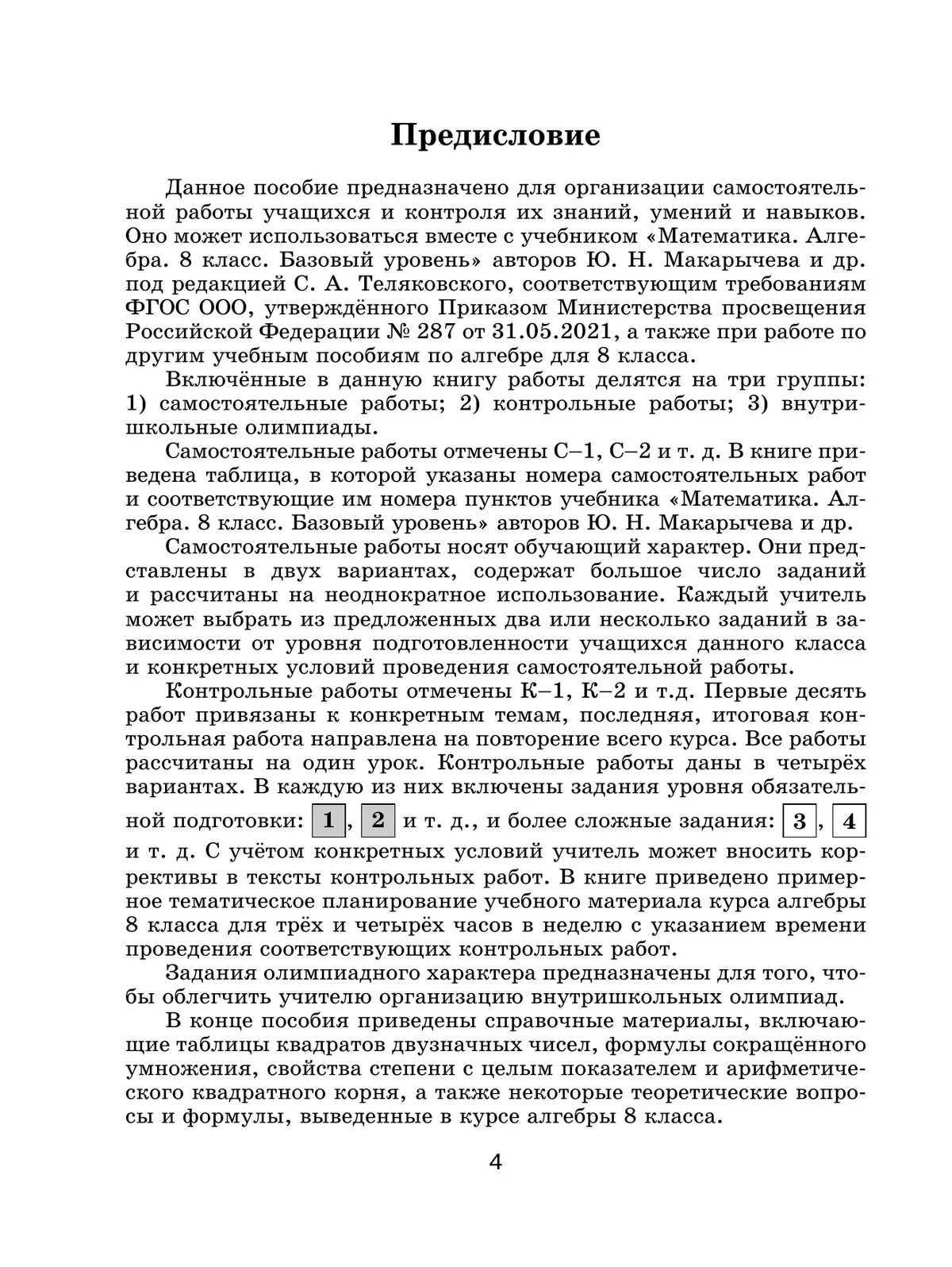 Учебное пособие является частью учебно-методического комплекта «Математика. Алгебра. 8 класс. Базовый уровень» Ю. Н. Макарычева, Н. Г. Миндюк, К. И. Нешкова и др., подготовленного в соответствии с требованиями Федерального государственного образовательного стандарта основного общего образования, утверждённого Приказом Министерства просвещения Российской Федерации № 287 от 31.05.2021.