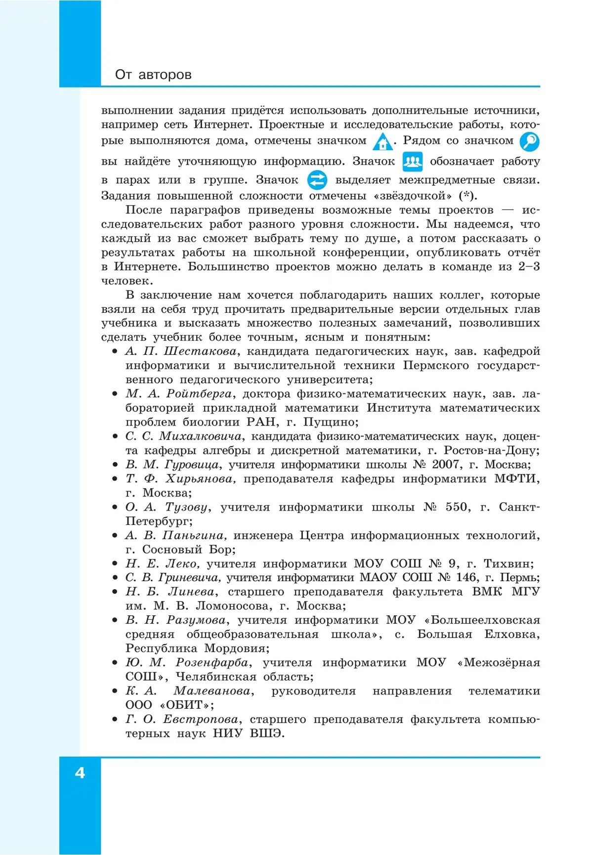 Рассматриваются вопросы передачи информации, базы данных, разработка веб-сайтов, компьютерное моделирование, алгоритмизация и программирование, методы объектно-ориентированного программирования, компьютерная графика и анимация. Учебник входит в учебно-методический комплект, включающий также учебник для 10 класса, методическое пособие и задачник.