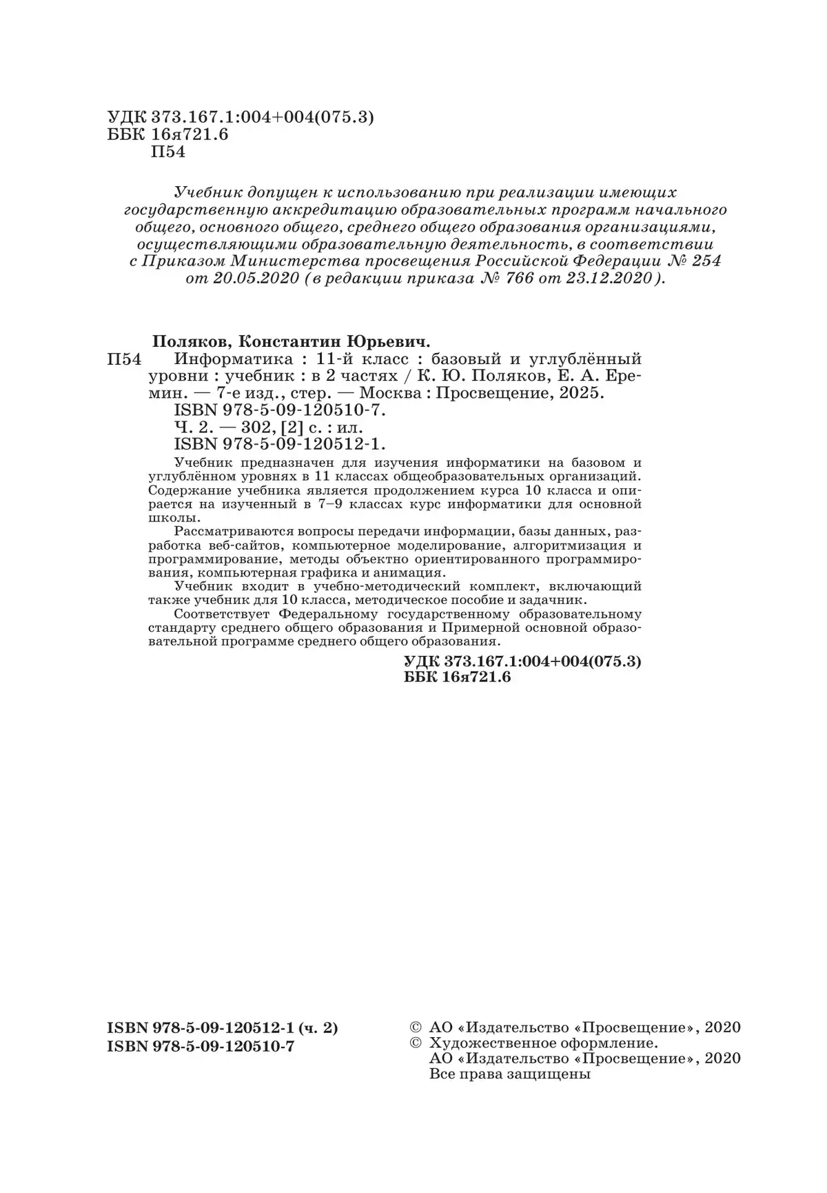 Информатика. 11 класс. Учебник. Часть 2. Базовый и углубленный уровни. (Просвещение)