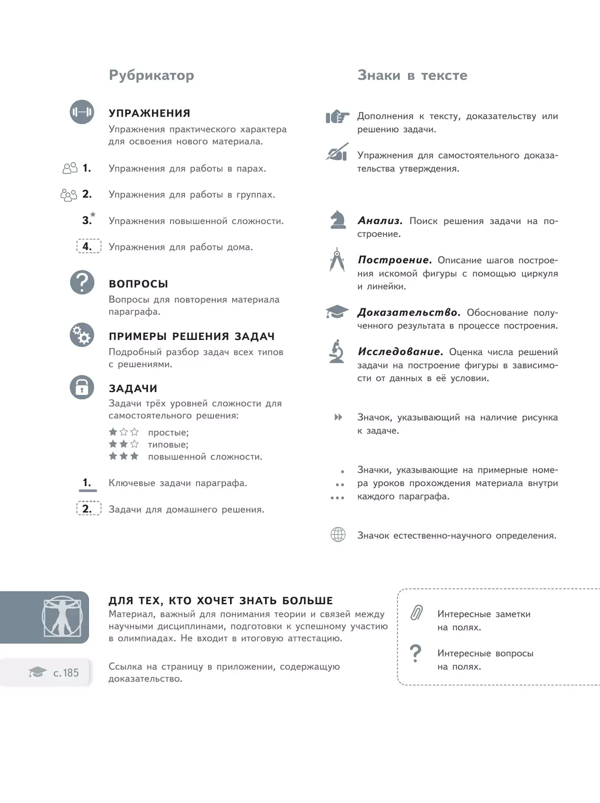 Задачный материал дифференцирован по уровню сложности, при этом выделяются ключевые задачи и задачи для работы дома. Имеется рубрика «Для тех, кто хочет знать больше», интересные заметки и вопросы на полях.