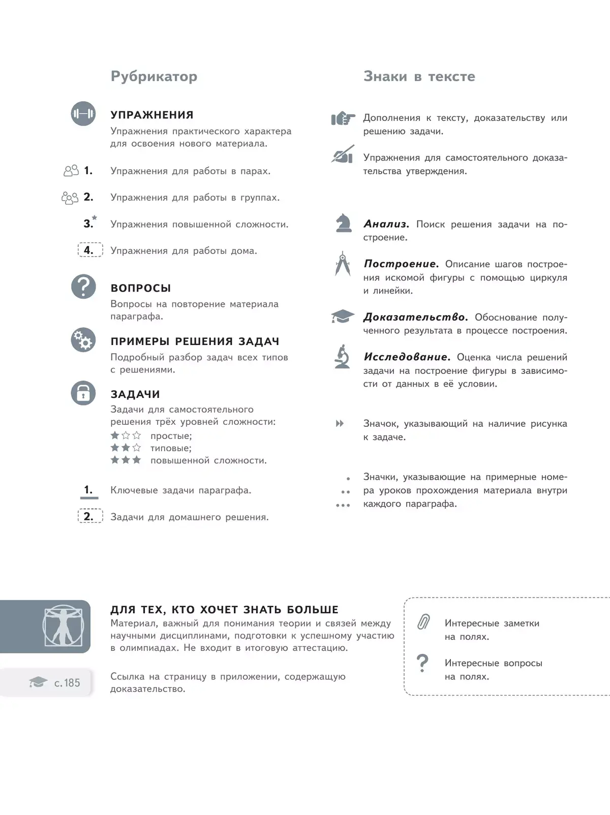 Задачный материал дифференцирован по уровню сложности, при этом выделяются ключевые задачи и задачи для работы дома. Имеется рубрика «Для тех, кто хочет знать больше», интересные заметки и вопросы на полях.