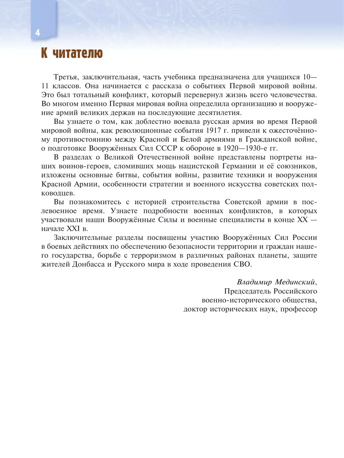 Учебник предназначен для учащихся суворовских, нахимовских, кадетских училищ, кадетских классов, для тех, кто хочет выбрать профессию военного, и также для всех, кто интересуется военной историей нашей страны.