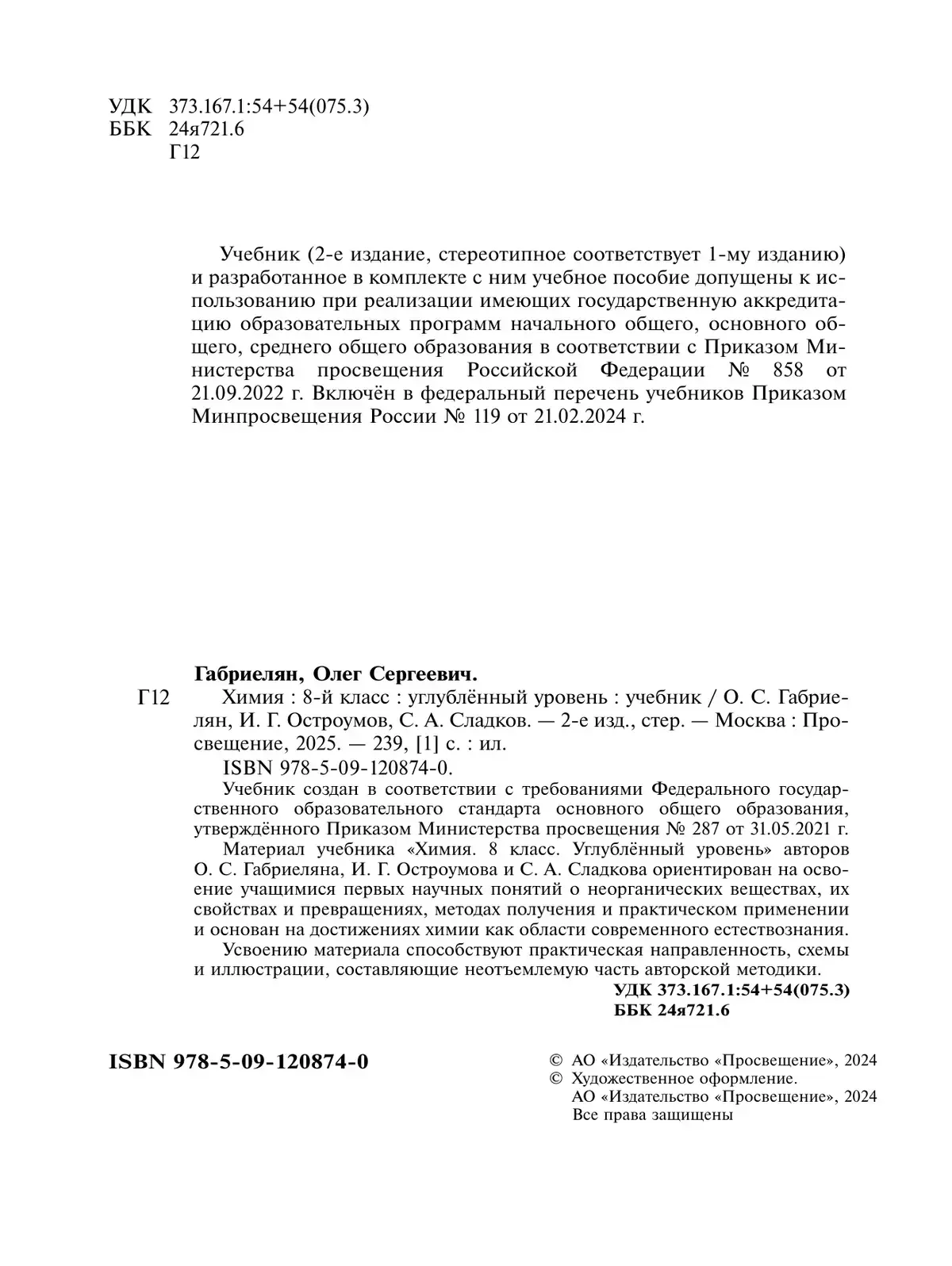 Материал учебника «Химия. 8 класс. Углублённый уровень» авторов О. С. Габриеляна, И. Г. Остроумова и С. А. Сладкова ориентирован на освоение учащимися первых научных понятий о неорганических веществах, их свойствах и превращениях, методах получения и практическом применении и основан на достижениях химии как области современного естествознания.