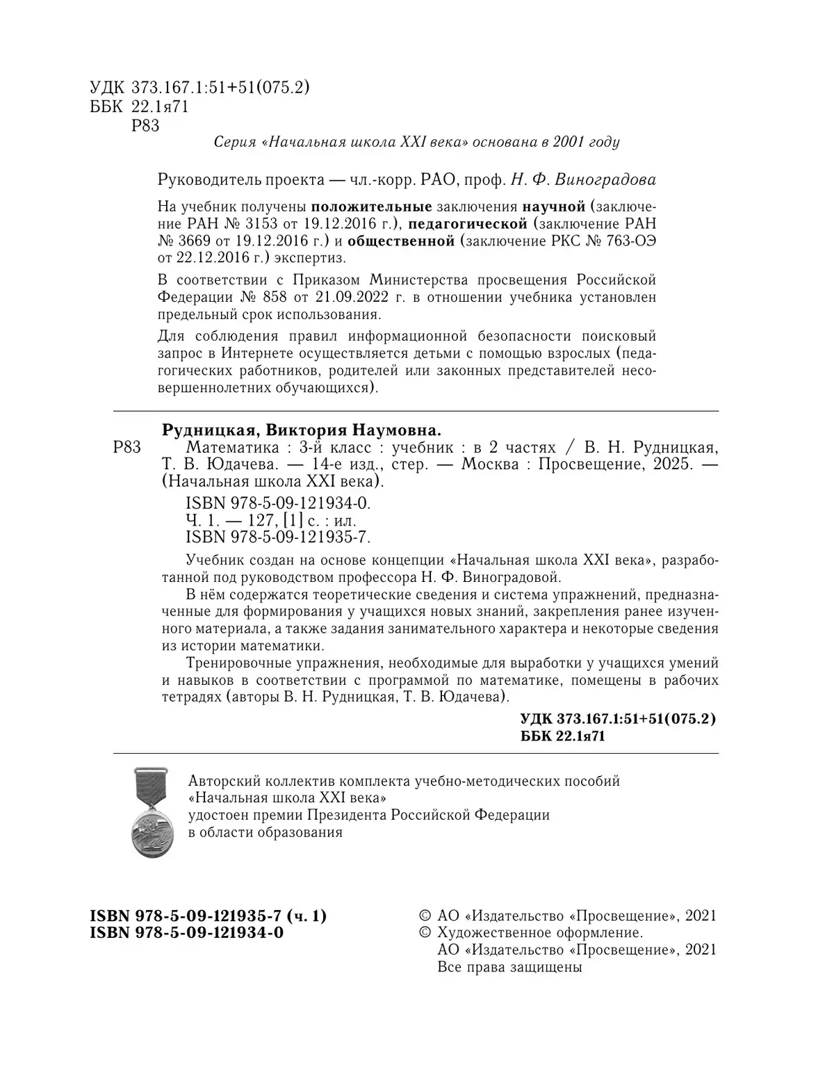 Учебник создан на основе концепции «Начальная школа XXI века», разработанной под руководством профессора Н. Ф. Виноградовой. В нём содержатся теоретические сведения и система упражнений, предназначенные для формирования у учащихся новых знаний, закрепления ранее изученного материала, а также задания занимательного характера и некоторые сведения из истории математики.