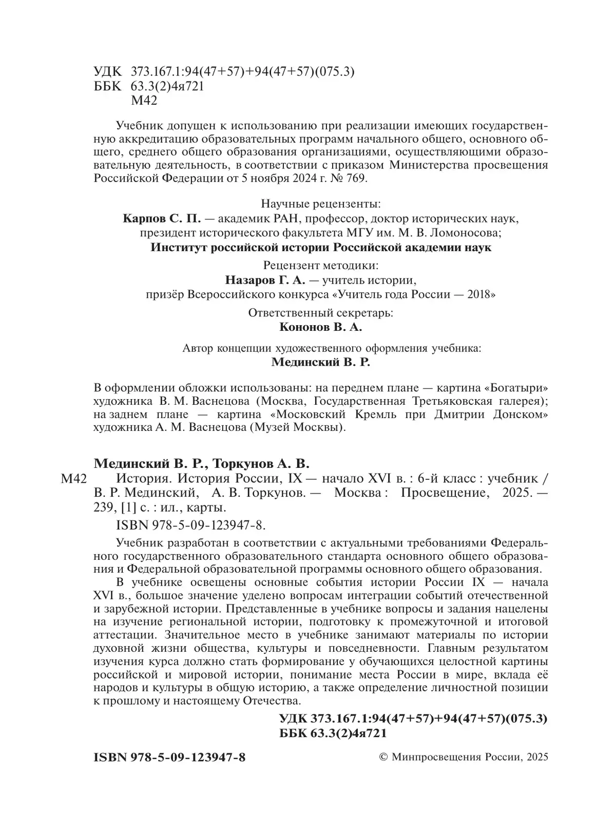 Учебник разработан в соответствии с актуальными требованиями Федерального государственного образовательного стандарта основного общего образования и Федеральной образовательной программы основного общего образования. В учебнике освещены основные события истории России IX — начала XVI в., большое значение уделено вопросам интеграции событий отечественной и зарубежной истории.