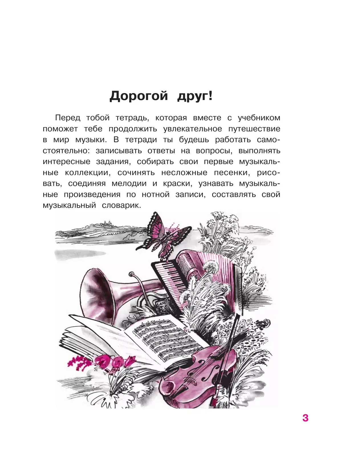Рабочая тетрадь входит в учебно-методический комплект «Музыка» для 3 класса общеобразовательных учреждений авторов Е. Д. Критской, Г. П. Сергеевой, Т. С. Шмагиной. Она содержит вопросы и творческие задания для самостоятельной работы учащихся. Тетрадь доработана в соответствии с требованиями ФГОС.